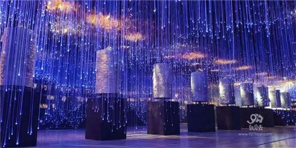此外,石空国石博物馆有一祈福馆,内特意设置了两排转经筒,让参观者可以从门口一直转到镇馆奇石面前。流线型的灯光垂在馆内,颜色变幻无常。走进馆中,犹如来到了一个梦幻星空。在这里,随时可以拍出在朋友圈刷屏的照片。