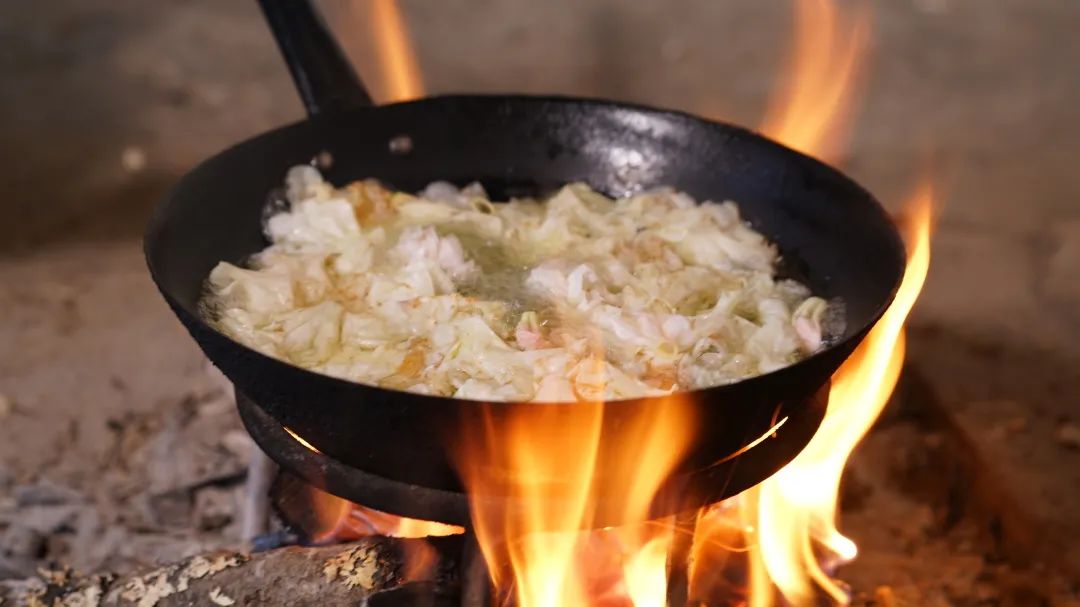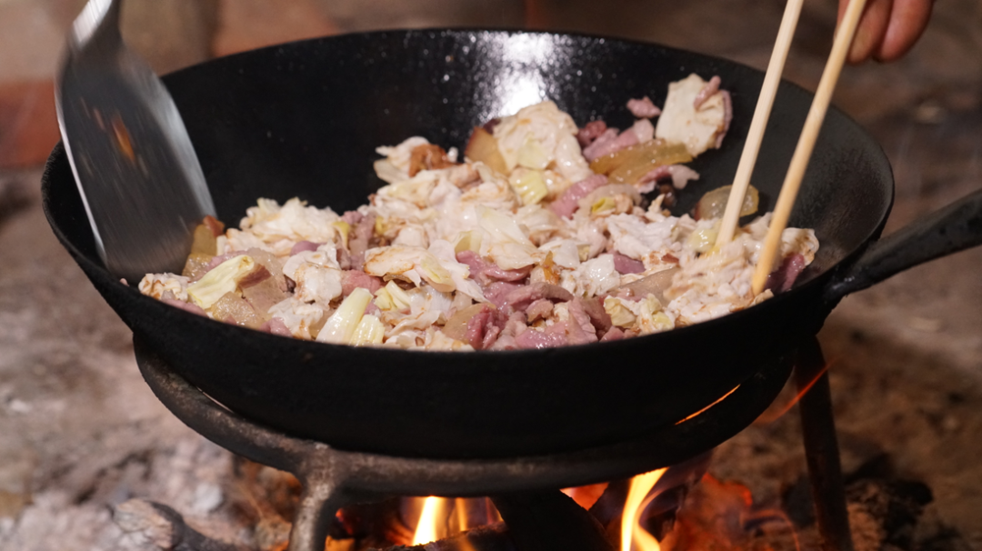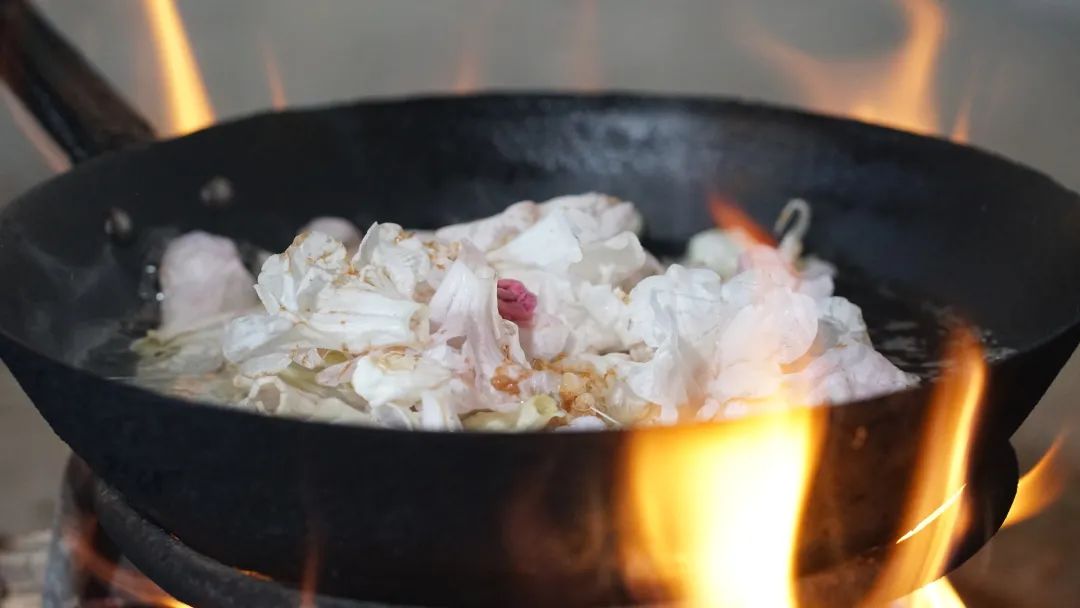 跟着环体兰把处理好的大白花与火腿一起放入锅中加少许盐,和着大油大火快炒,火腿的肉香和着大白花的花香,火腿的绵和着大白花的脆韧,那口感简直了,让人根本就停不下筷子,直到盘光花尽方罢休。
