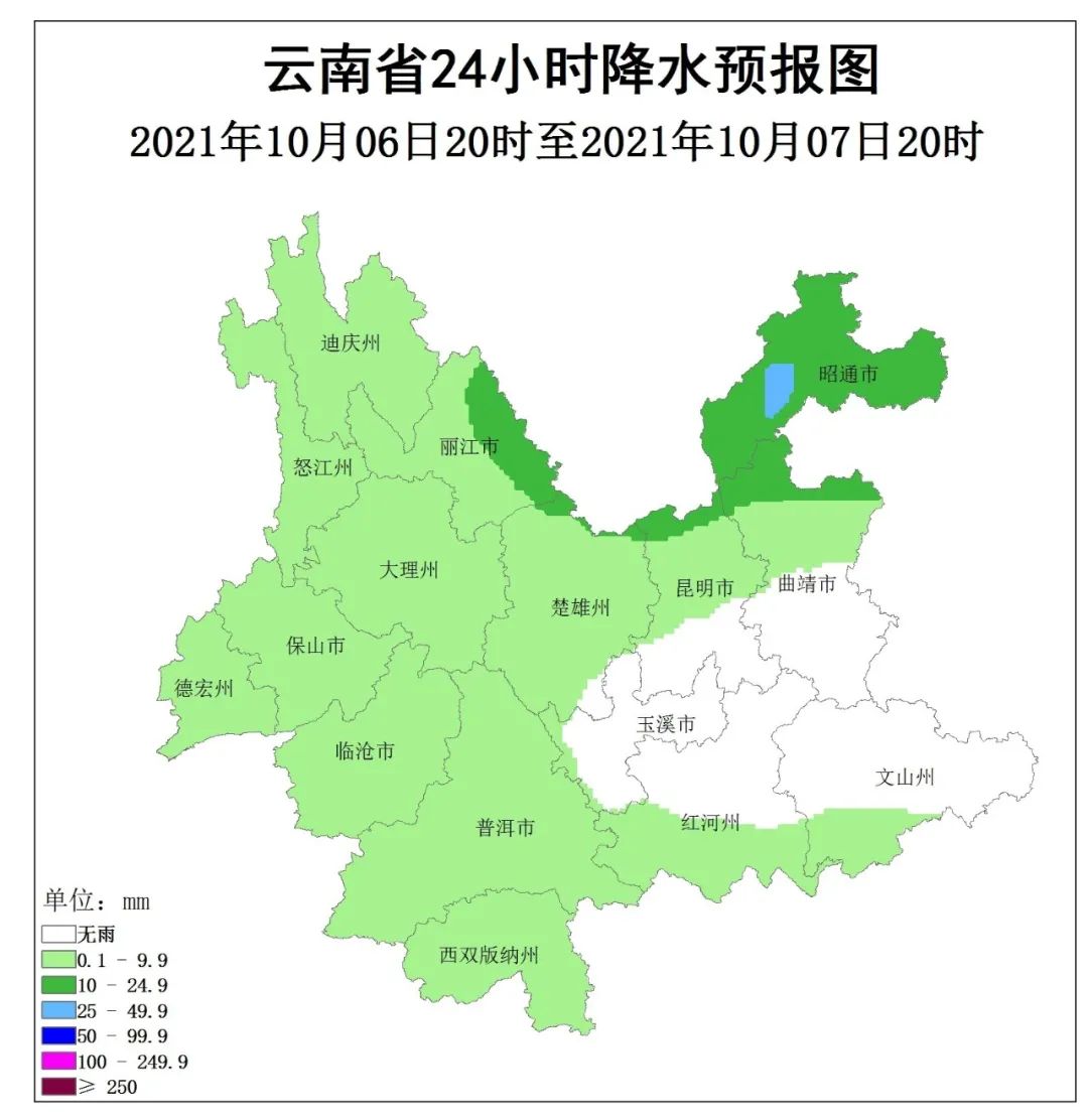 10月06日20时到10月07日20时:昭通、曲靖北部、昆明北部、楚雄北部、丽江东部阴天间多云有小到中雨局部大雨,曲靖南部、文山北部、昆明南部、玉溪、红河北部多云,其他地区多云有阵雨局部中雨。