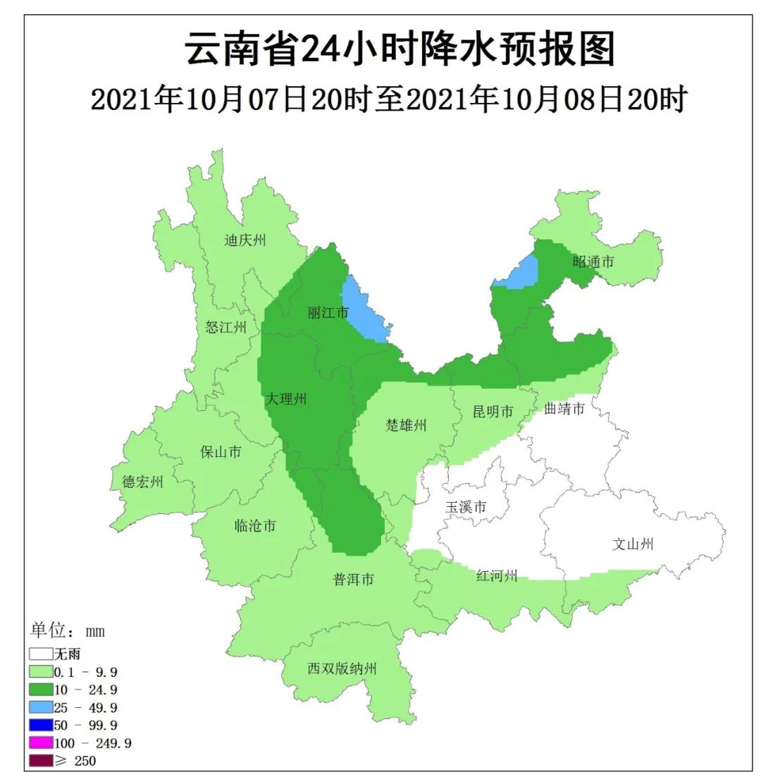 10月07日20时到10月08日20时:昭通南部、曲靖北部、昆明北部、楚雄北部、丽江、大理东部、普洱北部阴天间多云有小到中雨局部大雨,曲靖南部、文山北部、玉溪、红河北部多云,其他地区多云有阵雨局部中雨。