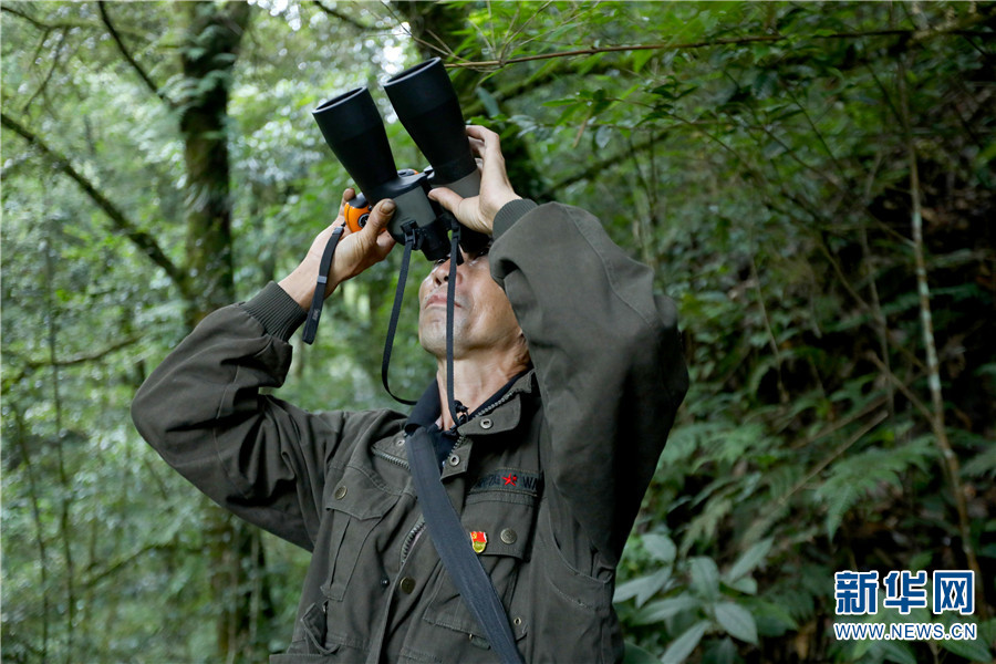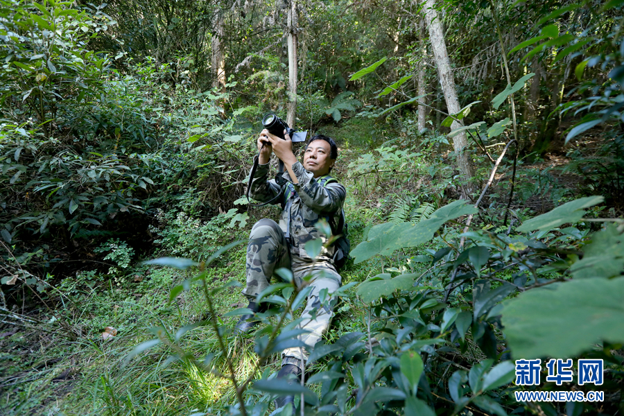 (图为罗开春在进行野生动植物监测(9月25日摄)。新华网 李浩 摄)