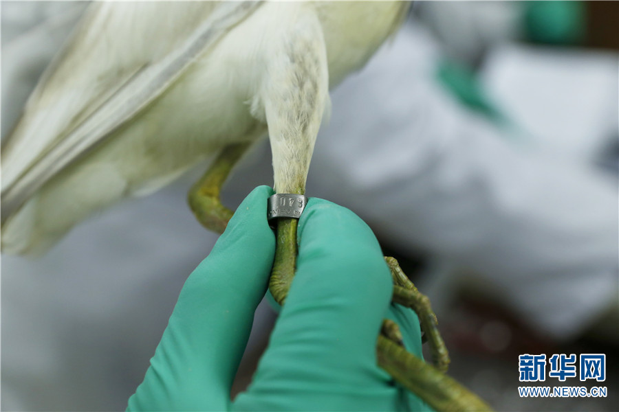 (图为袁玉川将刻有编号的特殊金属环固定在鸟儿的跗跖上(9月27日摄)。新华网 赵普凡 摄)