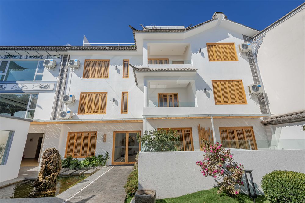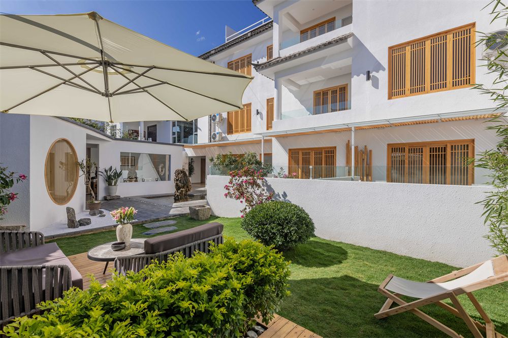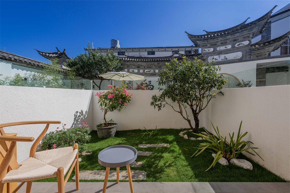 民宿整体将白族民居青瓦白墙现代美感结合,凸显简约素雅,给这方小院平添几分大气。院子里是最舒适的地方,晨光出现,从敞开的大门往里看去,小园香径,草色青青,绿植环绕,早起的客人坐在院子里喝着茶,吃着民宿提供的热腾腾的早餐,在这里,可以安静地给心灵放个假,惬意满分。