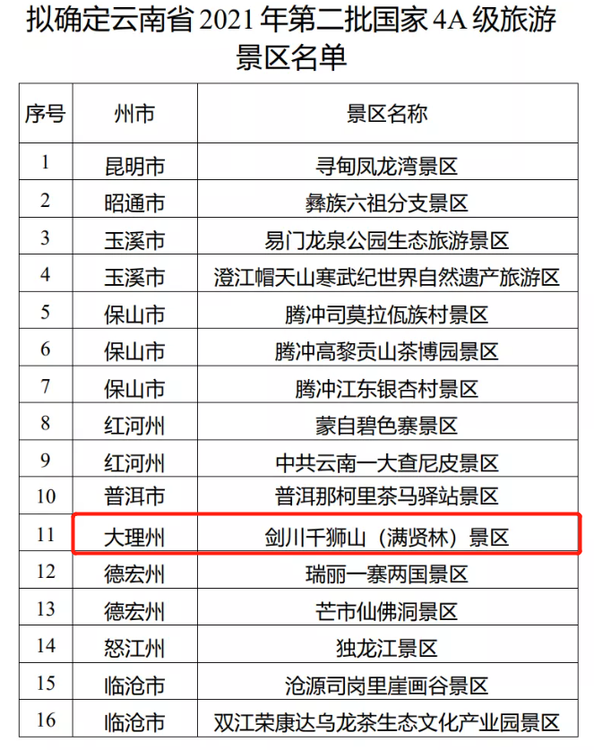 依照国家标准《旅游景区质量等级管理办法》和《旅游景区质量等级的划分与评定》,经相关州市文化和旅游局初评、推荐,云南省文化和旅游厅按程序组织评定,寻甸凤龙湾景区等16家景区达到国家4A级旅游景区的标准,拟确定为云南省2021年第二批国家4A级旅游景区。现将拟确定名单予以公示,公示期为2021年12月15日至12月21日。