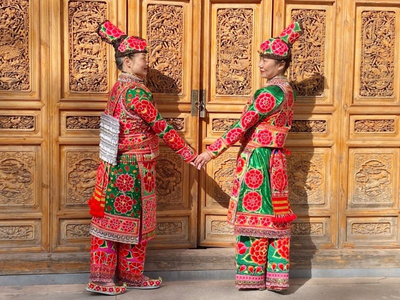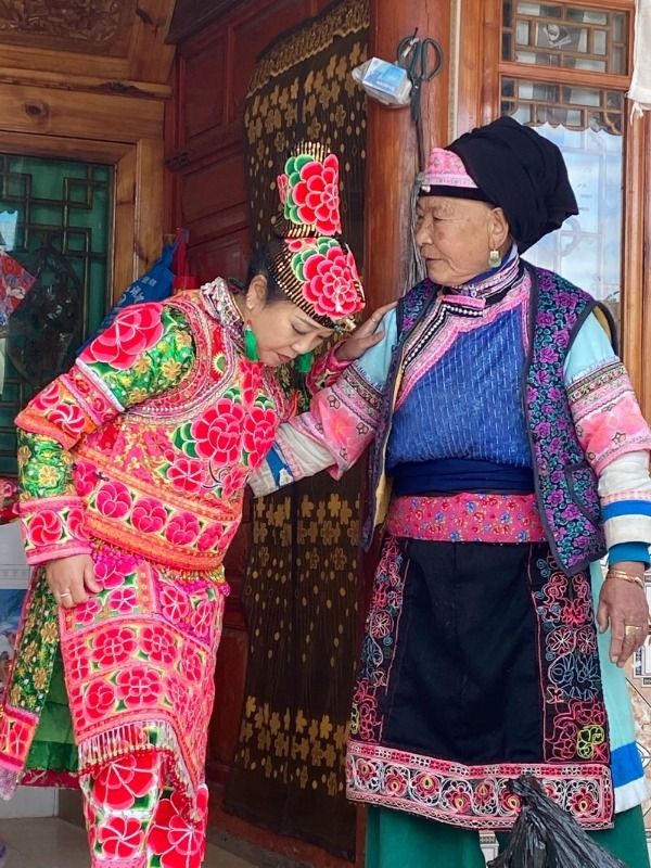 同行的女性朋友们穿上了花团锦簇的彝家华服,美美地来一波美拍。单拍、合影,男士们的手机和相机根本就停不下来,一张又一张,女士们的笑脸定格在手机和相机的屏幕上,笑声回荡在闭家村的一个个小巷里,洒在彝家小院的大门口,洒在古老的大青树下,洒在青青的麦苗地边……