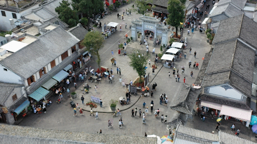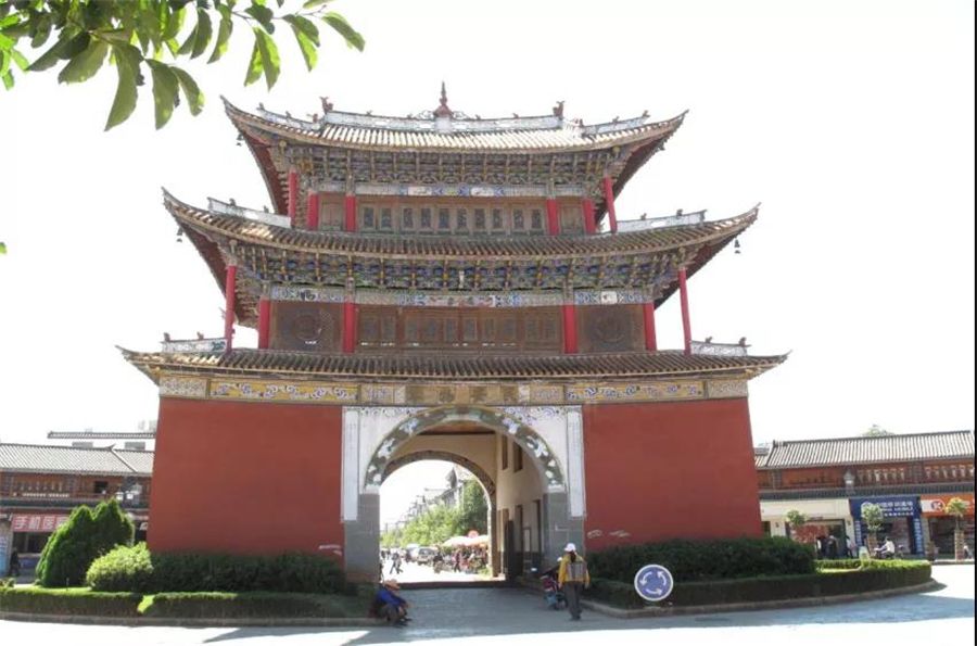 大理州鹤庆县云鹤镇传统古街,平面呈长方形,街巷为棋盘式规整布局,官署及吏府居于正北向,文庙、书院、学堂等居于东南隅,居住社区与市场分布于规整的街坊内,具有北方城池 “街坊制”的特点。