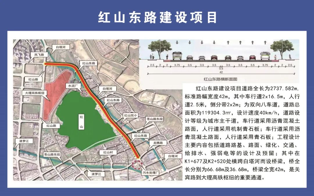 红山东路起于龙腾路,止于红山路,是关宾路到高铁枢纽的重要通道。道路全长2.7公里,为双向八车道,标准路幅宽度42米,建设项目工程包括道路路基、路面、绿化、交通、给排水、强弱电等的设计及预留,总投资约2.4亿元。