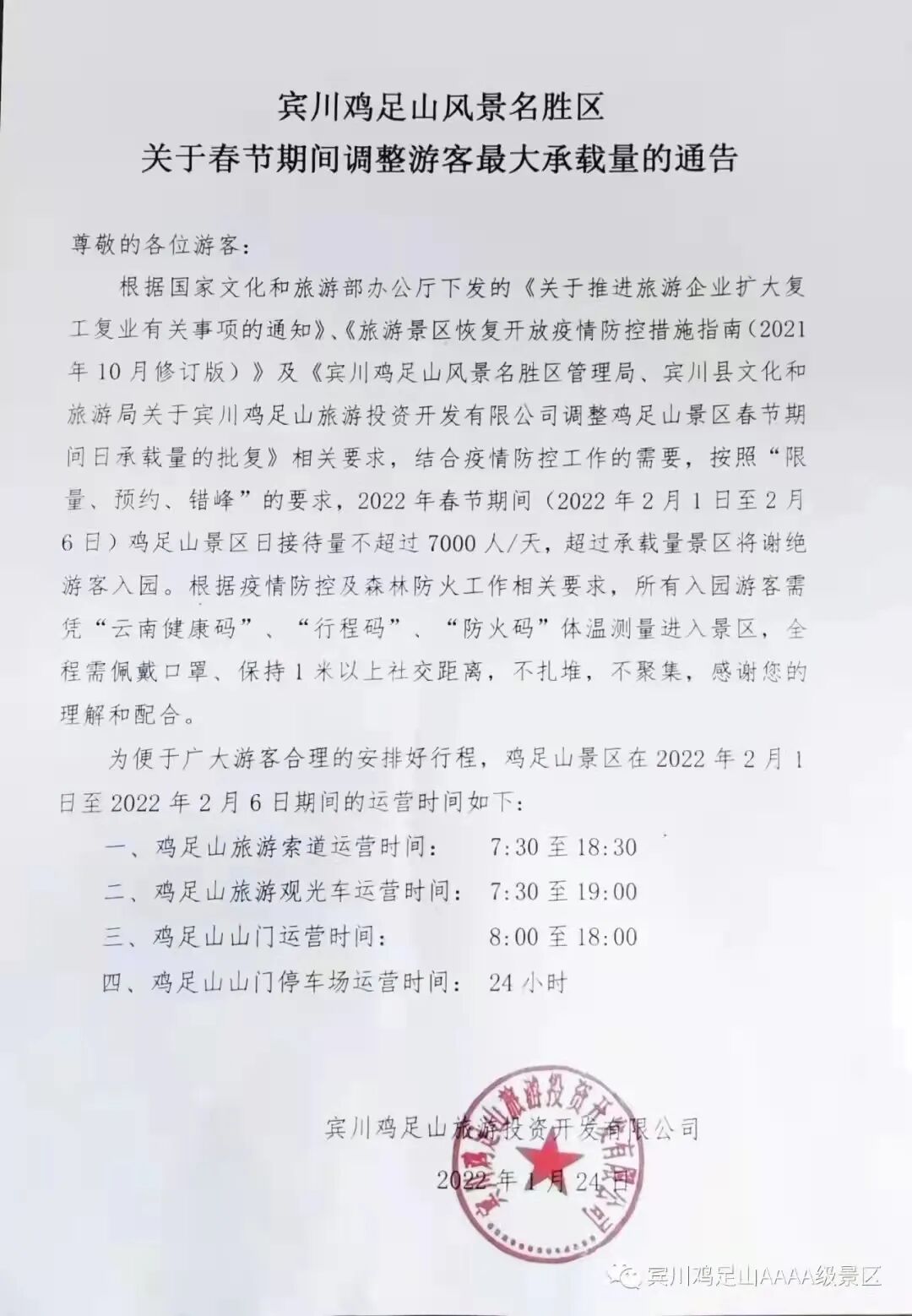 根据国家文化和旅游部办公厅下发的《关于推进旅游企业扩大复工复业有关事项的通知》、《旅游景区恢复开放疫情防控措施指南(2021年10月修订版)》及《宾川鸡足山风景名胜区管理局、宾川县文化和旅游局关于宾川鸡足山旅游投资开发有限公司调整鸡足山景区春节期间日承载量的批复》相关要求,结合疫情防控工作的需要,按照“限量、预约、错峰”的要求,2022年春节黄金周期间(2022年2月1日至2月6日)鸡足山景区日接待量不超过7000人/天,达到日最大承载量景区将停止接待游客。2022年2月1日12:00分,鸡足山景区已接近日接待最大承载量,根据疫情防控及森林防火工作相关要求,景区预计在 13 :00分停止销售当日景区门票并停止接待游客,请计划到鸡足山的游客合理安排行程,感谢您的理解和配合,由此给您带来不便,敬请谅解!