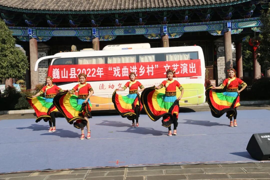 当天的戏曲进乡村展演节目有:《金花霸王鞭》《乐器演奏》《彝族打歌》《东山刀舞》《等等着》《男声独唱〈家在大理〉》《山歌联唱》《傣族舞蹈》《芦笙情》等,内容丰富,形式多样,丰富和活跃了春节期间群众文化生活,营造了喜庆、祥和的节日氛围,进一步弘扬了优秀传统文化,歌颂改革开放、政治稳定、社会安定的大好形势,让全县人民和广大游客度过一个欢乐、祥和、文明、喜庆的春节。