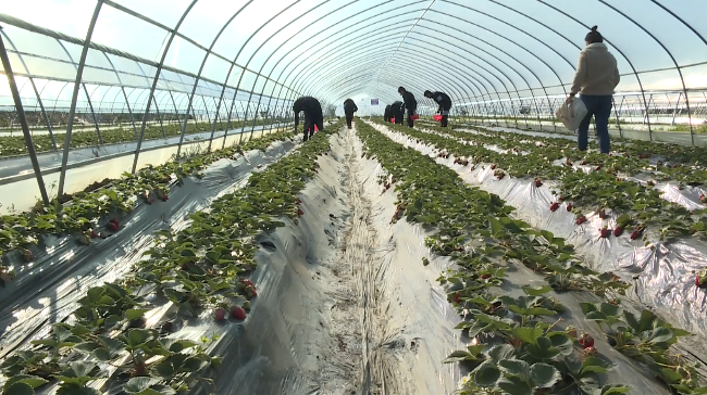 大东牛奶草莓基地负责人陈永林:“在政府的帮助下效益是非常不错的,现在正是草莓采摘季节,在此我们欢迎各位新老顾客,到我们园里来采摘草莓,采摘草莓的价格是30元一市斤。”