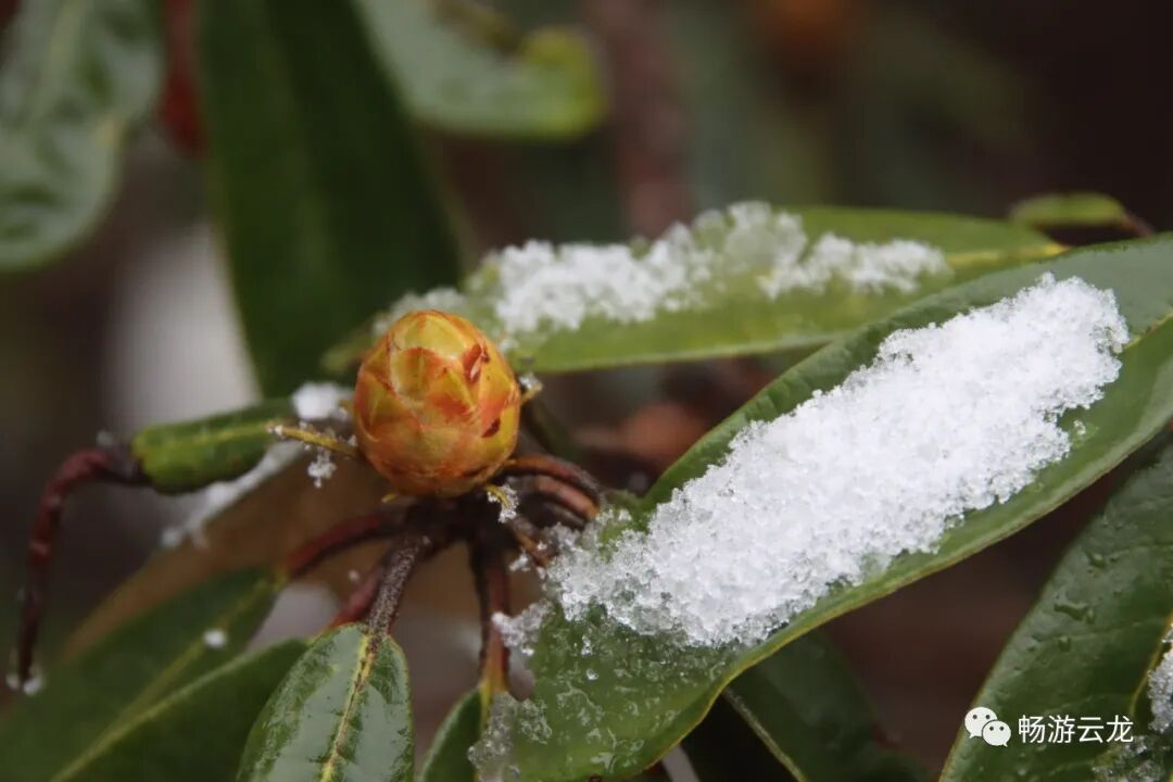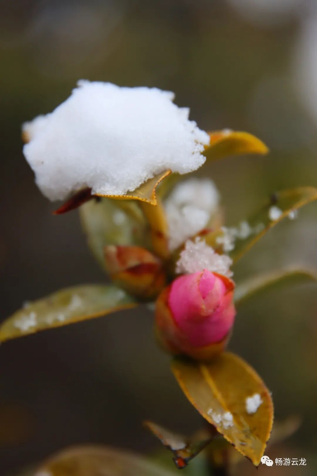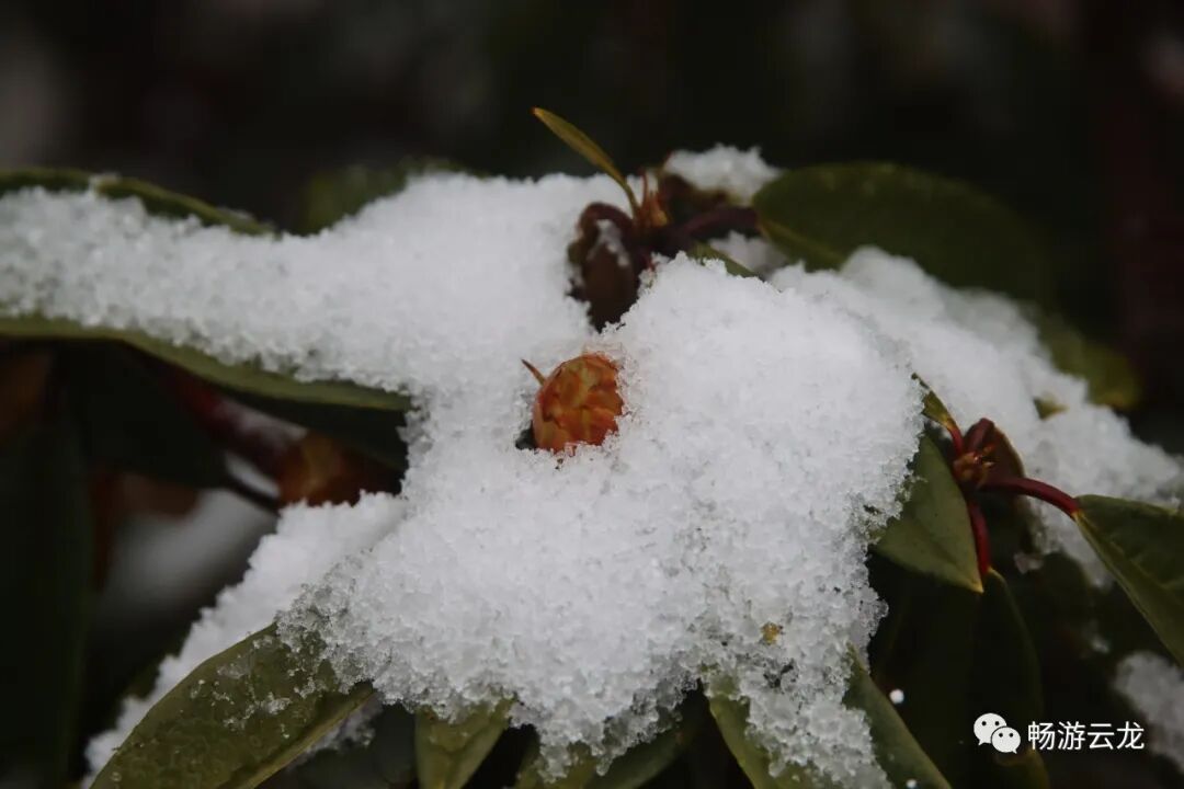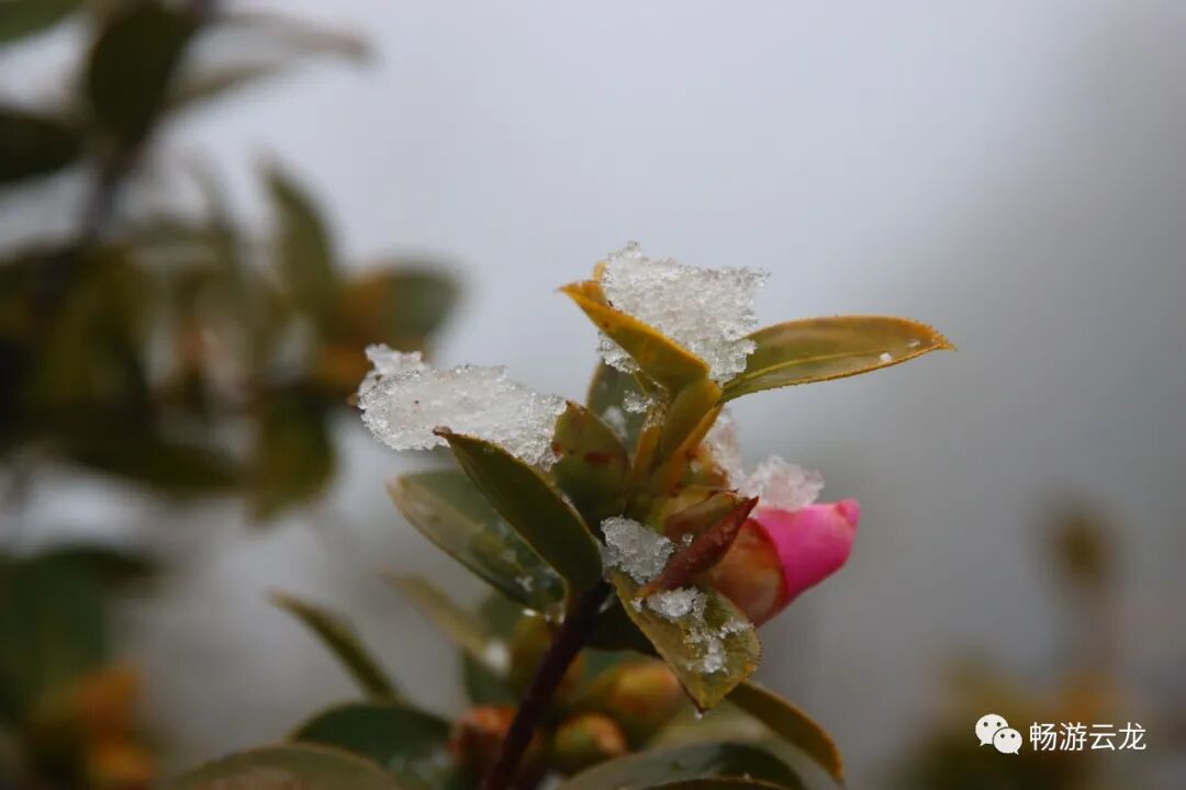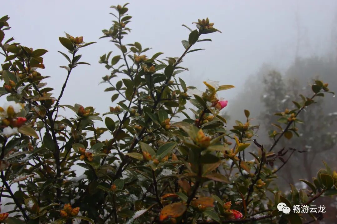 今年春节期间各地都下了几场雨,高海拔地区则飘起了雪,山里银装素裹,分外妖娆,引无数人狂抒诗意,发爆了抖音、快手与微信。2月6日我到云龙县西边的漕涧镇,去赶一个晚场,中午到漕涧镇后虽一直下着雨,但没有退却,寻了一张车直接到漕涧梁子上的六南公路丫口,见上百辆车停在路边,还有交警在值勤指挥,无数人在此赏雪景,我便融入其中,走在雪里有点冷,但看到那些无比喜悦的小朋友们在雪里的各种姿态,我也激情四溢,充满兴奋,拿起相机,选择角度,构思成图,拍了一些照片,特别是拍到了几枝含包待放的花蕾,原绽放的几朵红杜鹃(当地人俗称映山红)则已凋零,但雪里花蕾也别有韵味。突然间雪花又落,雾也起,能见度极低,只好放弃拍摄下山。下山后又去坝子感染了一次梅韵。