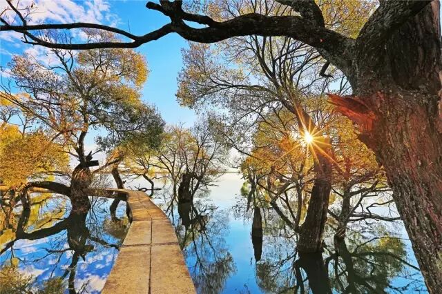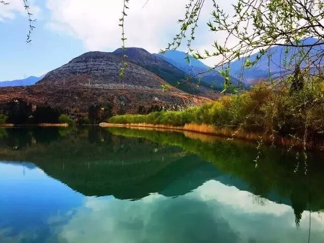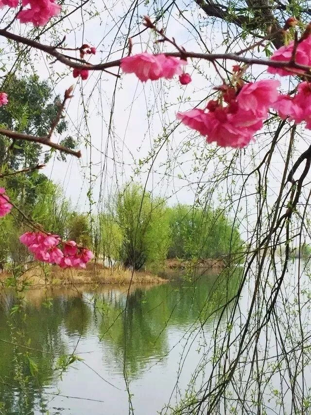 湛蓝清透的天空,温柔闲适的云朵,于水面之上映出清新明亮的倒影,水面的周围,那些刚刚萌发的绿意,那样娇柔,那样可爱。纤柔的新叶,一簇簇,一片片,于水天之间静静地铺开,似一个色调鲜亮的梦境。