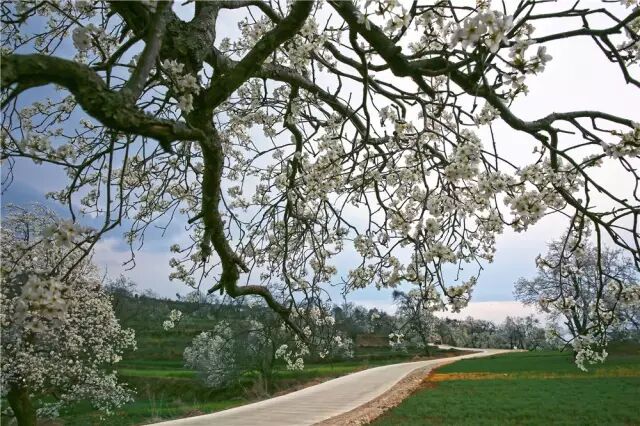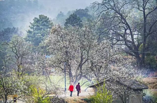 房前屋后,山林田野,到处都是一树树盛开的花朵,那纯白的色彩,随着枝干延伸,像是笔触飘逸的画作,梨花,小院,松毛堆,画中的一切都那么宁静美好。
