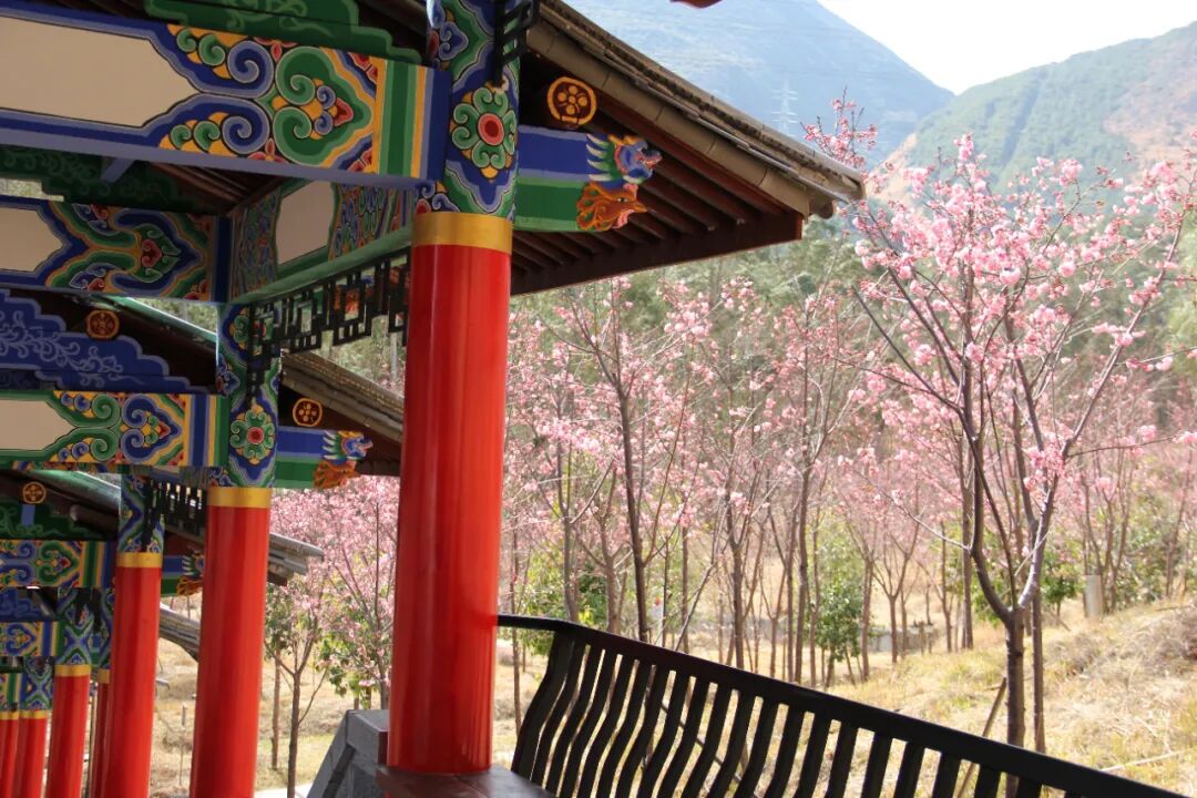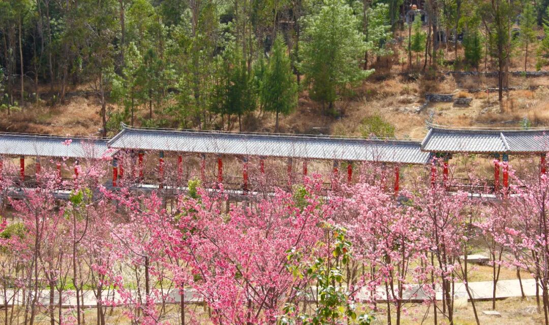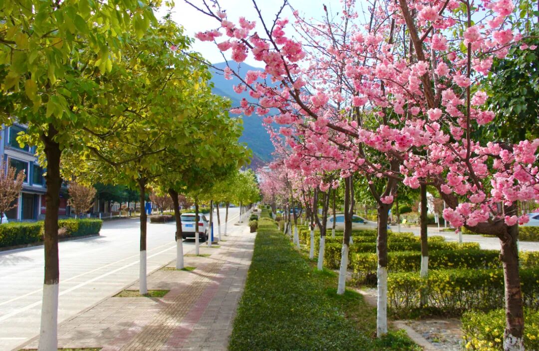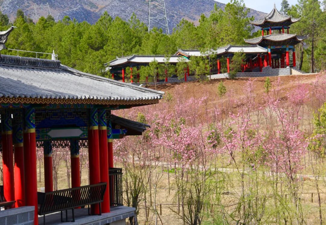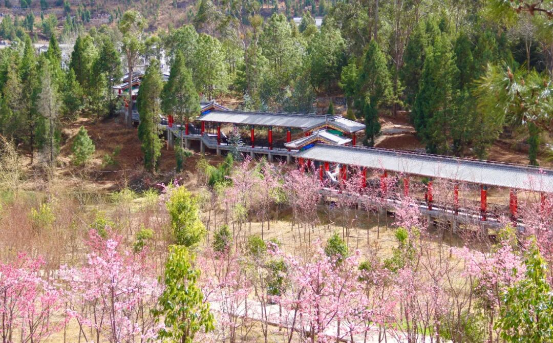 樱花湖公园内,数千株樱花竞相绽放。在樱花湖畔,一道靓丽的生态新景观——鹤庆生态文化长廊穿梭于苍松翠柏间,与盛开的樱花遥相呼应,绘就一幅绝美的山水画。