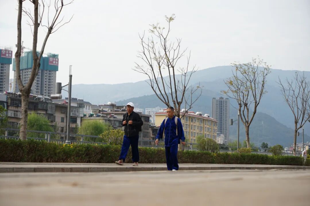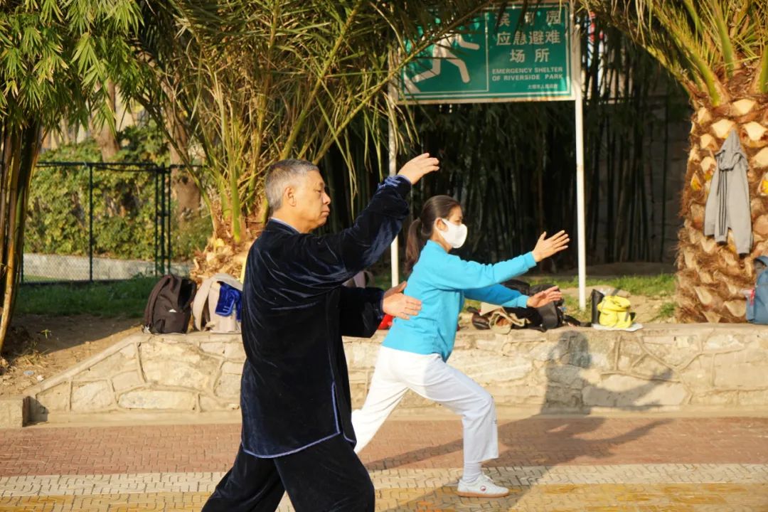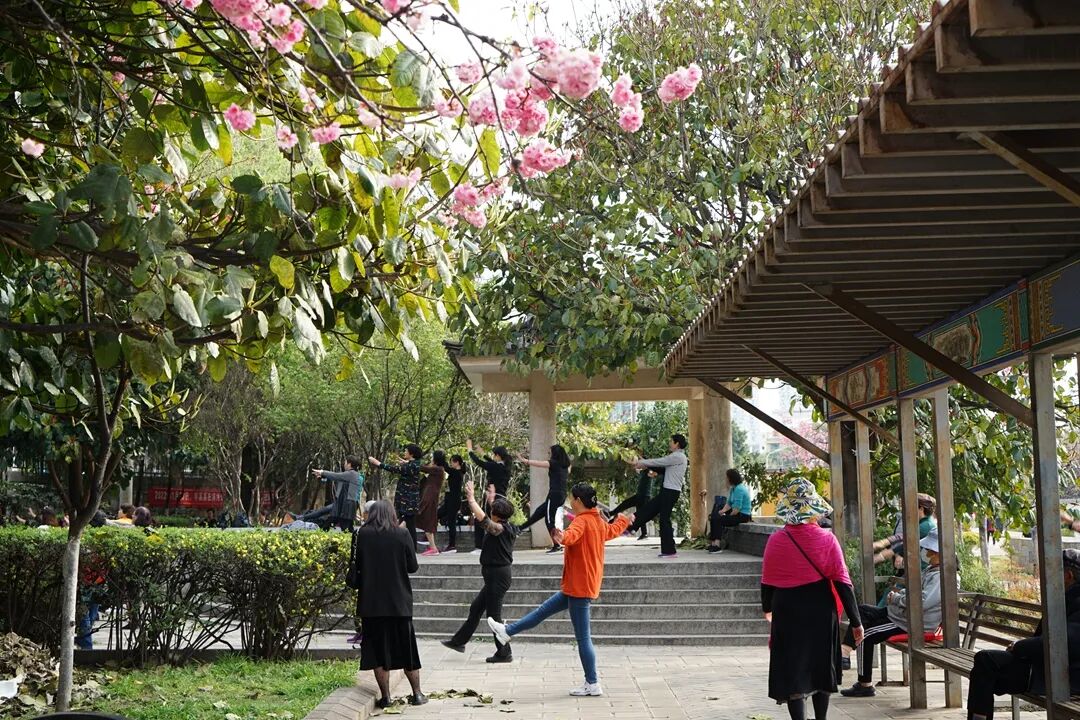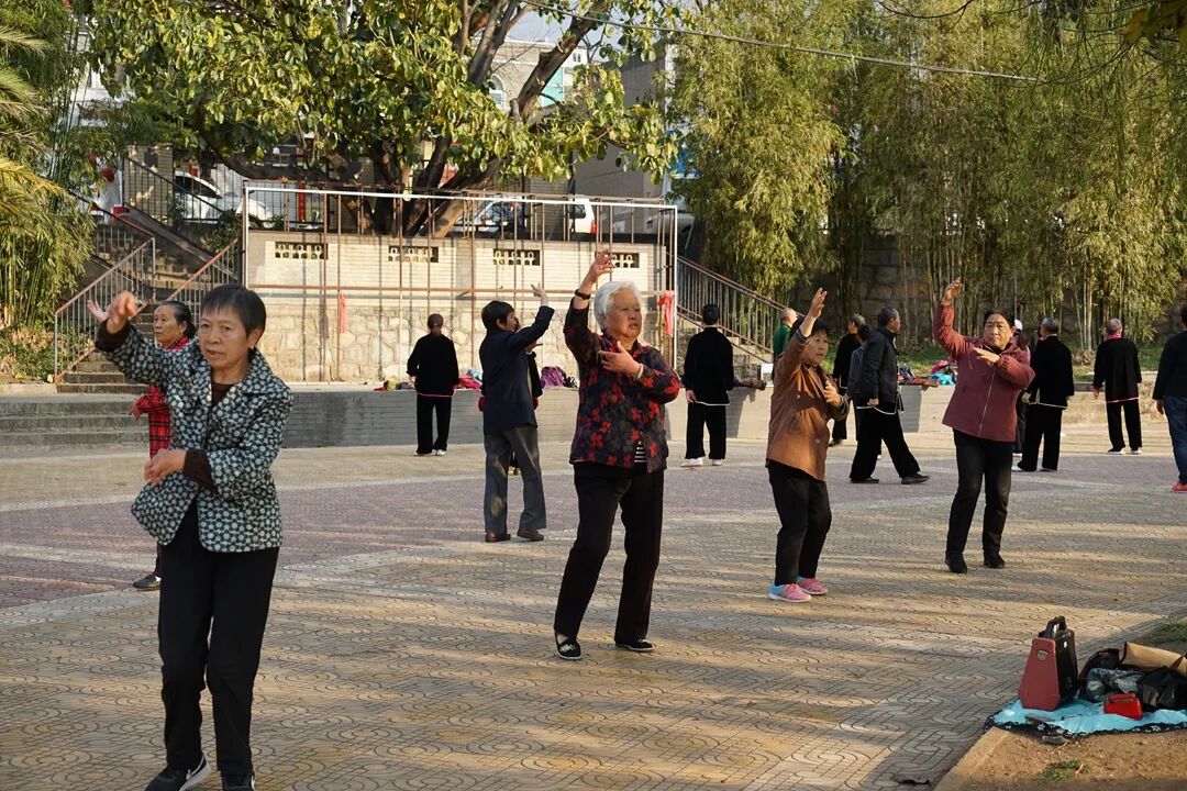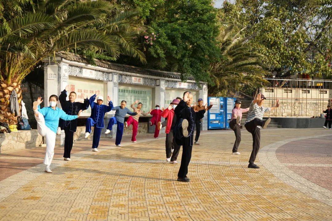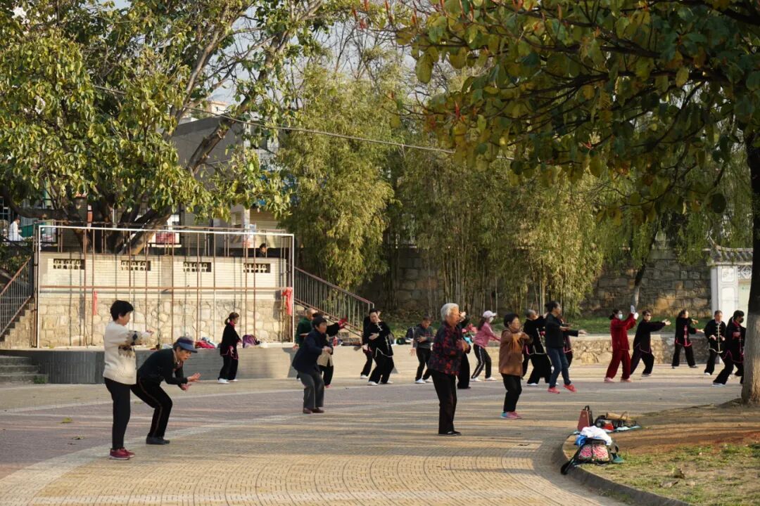 人们在健康步道上慢跑、晨练、起舞、练拳