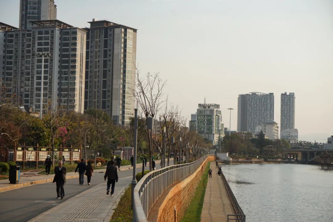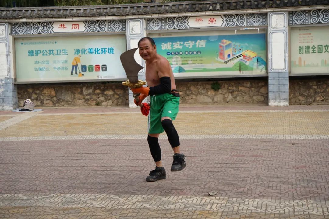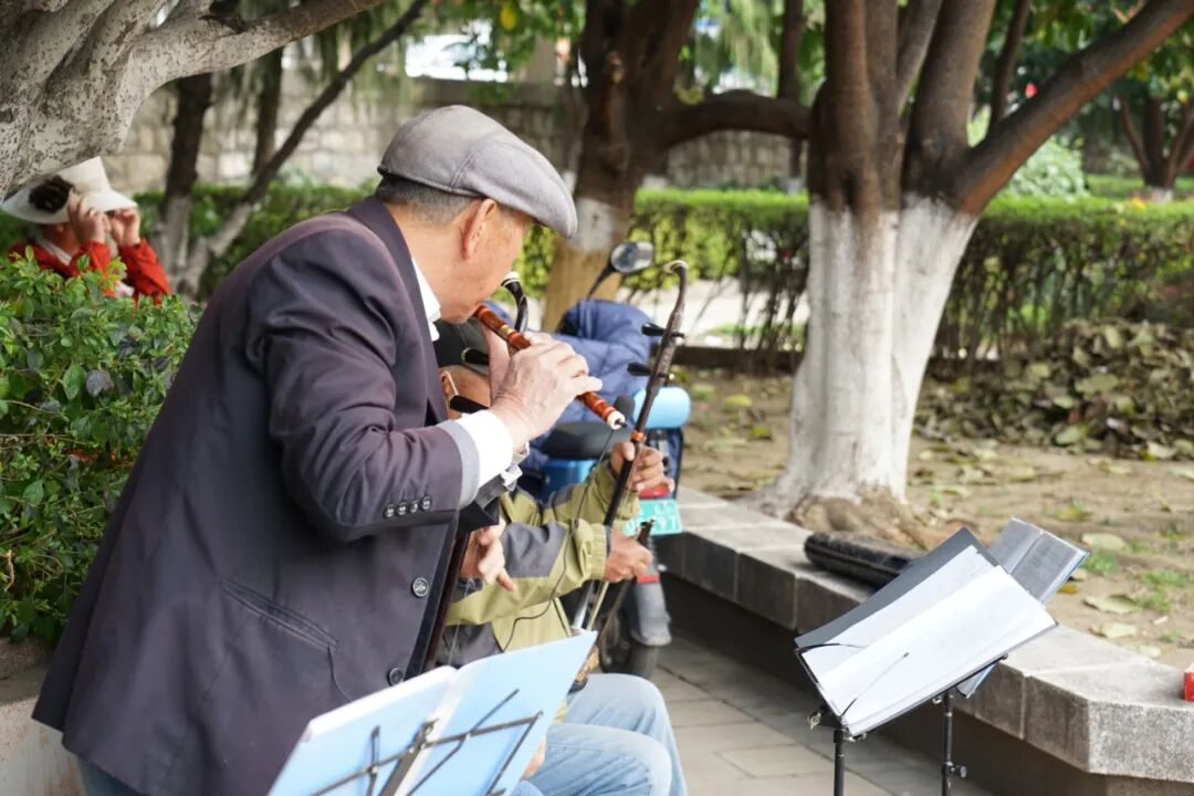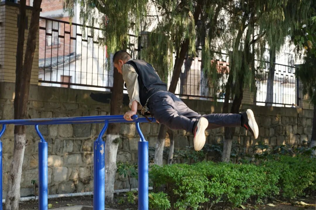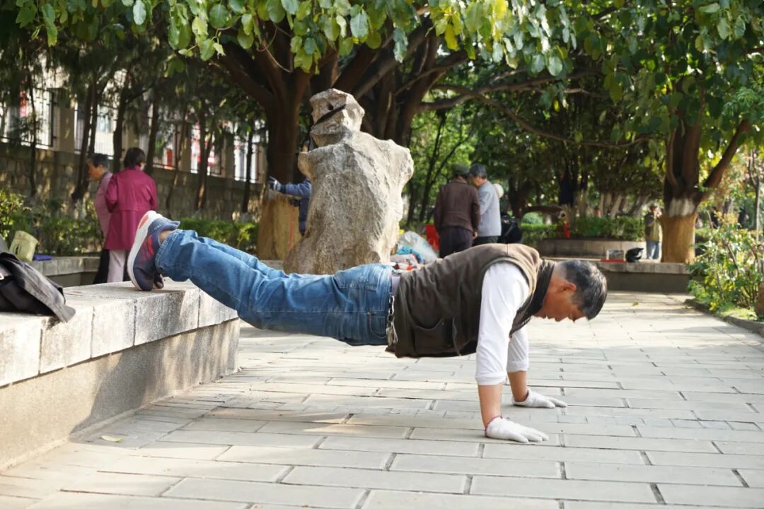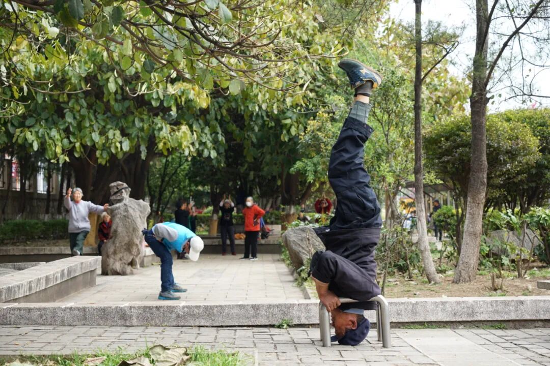 人们在健康步道上慢跑、晨练、起舞、练拳