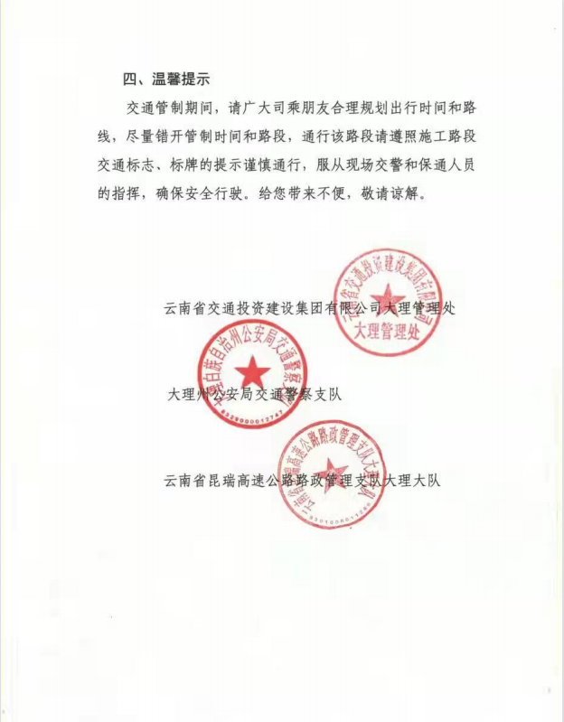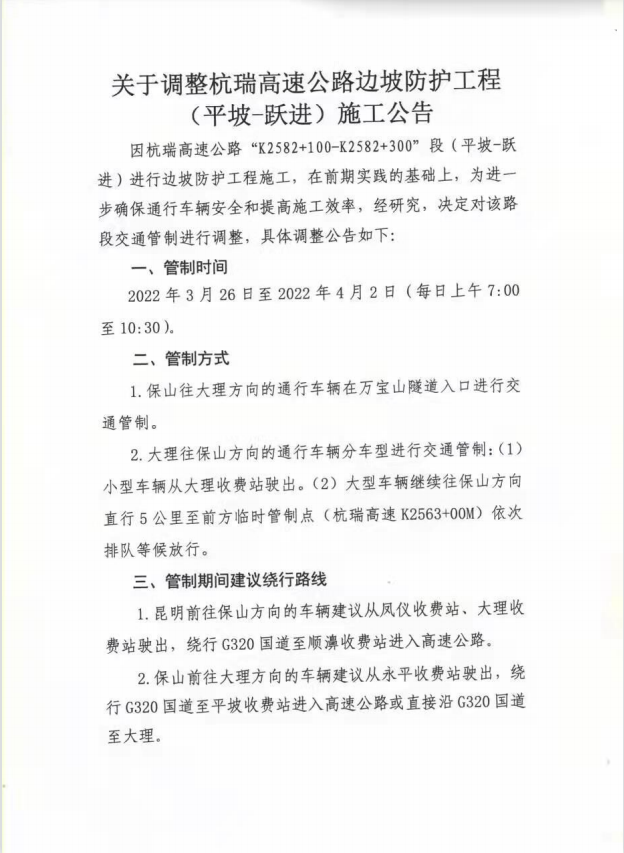 1、保山往大理方向的通行车辆在万宝山隧道入口进行交通管制。
