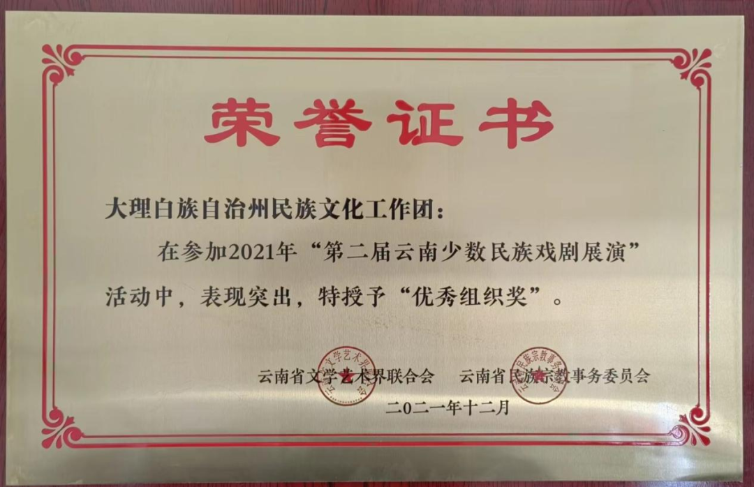 4月20日,第二届云南少数民族戏剧展演研讨会在昆明召开。会议针对此前举行的少数民族戏剧展演进行研讨和颁奖,由大理州白剧团报送参演的大型经典白剧《望夫云》(青春版)、白剧小戏《挂窗帘》《排污风波》均获优秀作品奖;大理州白剧团获优秀组织奖。
