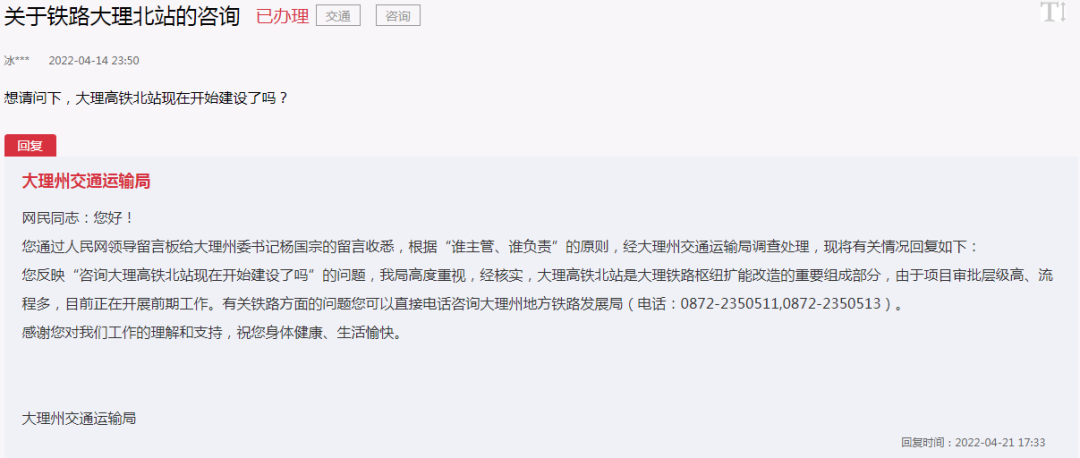 对此,大理州交通运输局回复:经核实,大理高铁北站是大理铁路枢纽扩能改造的重要组成部分,由于项目审批层级高、流程多,目前正在开展前期工作。