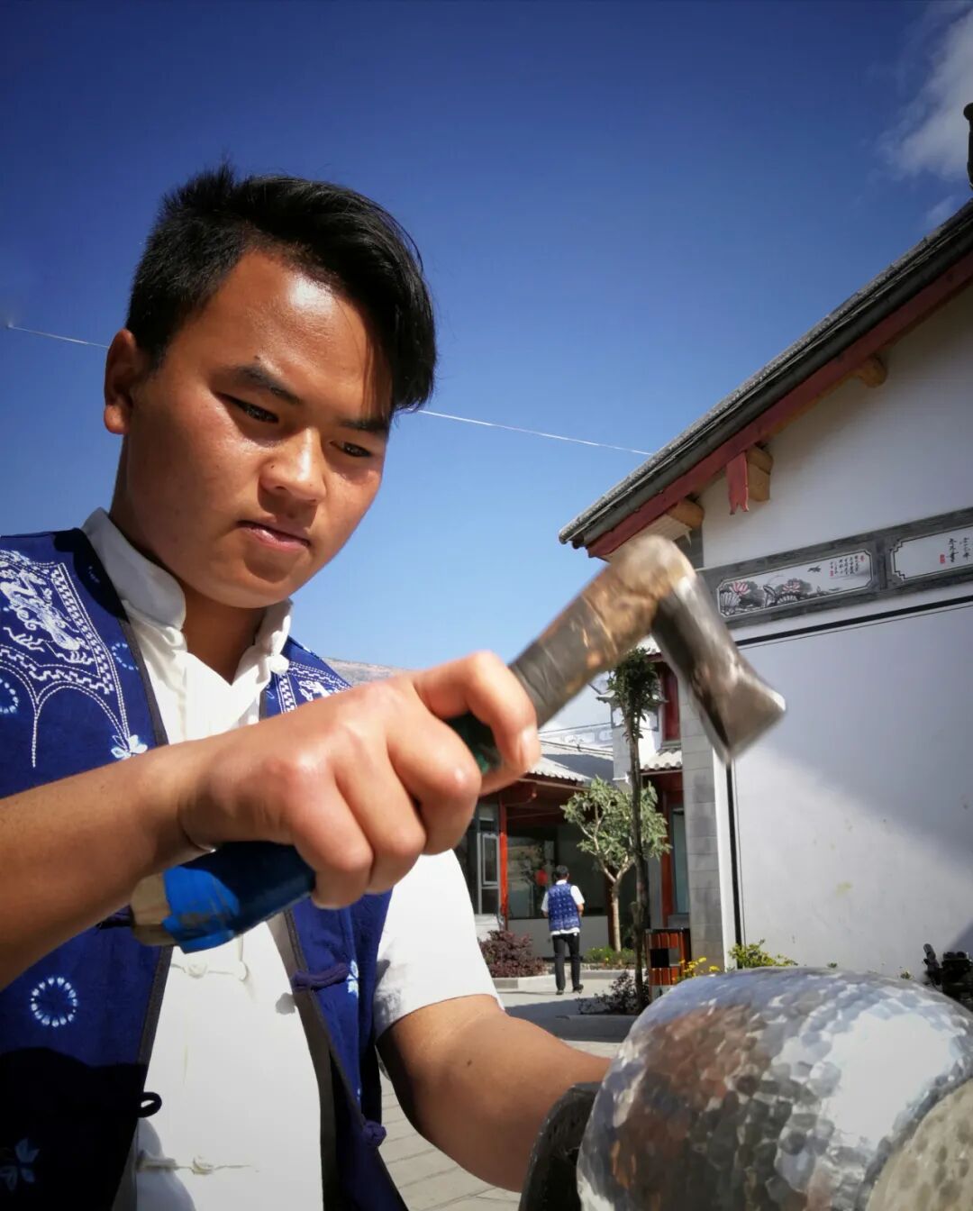 31岁的寸国龙是返乡创业大学生中的一员,他生长在新华村委会南邑村一个手工艺人世家,大学四年级开始学习手艺,毕业后又经过5年系统学习,今年开始与同样返乡创业的表弟一起开工作室,通过淘宝店网上销售银器,月销售利润可达1万至2万元。越来越多像寸国龙这样有知识、有文化的年轻人投身银匠队伍,成为推动传统手工艺创新发展的新兴力量。