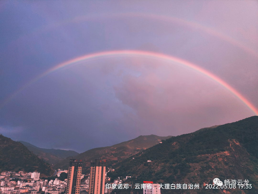 5月8日傍晚,云龙县城出现双彩虹。有网友有幸拍到县城上空的双彩虹,一起来欣赏。