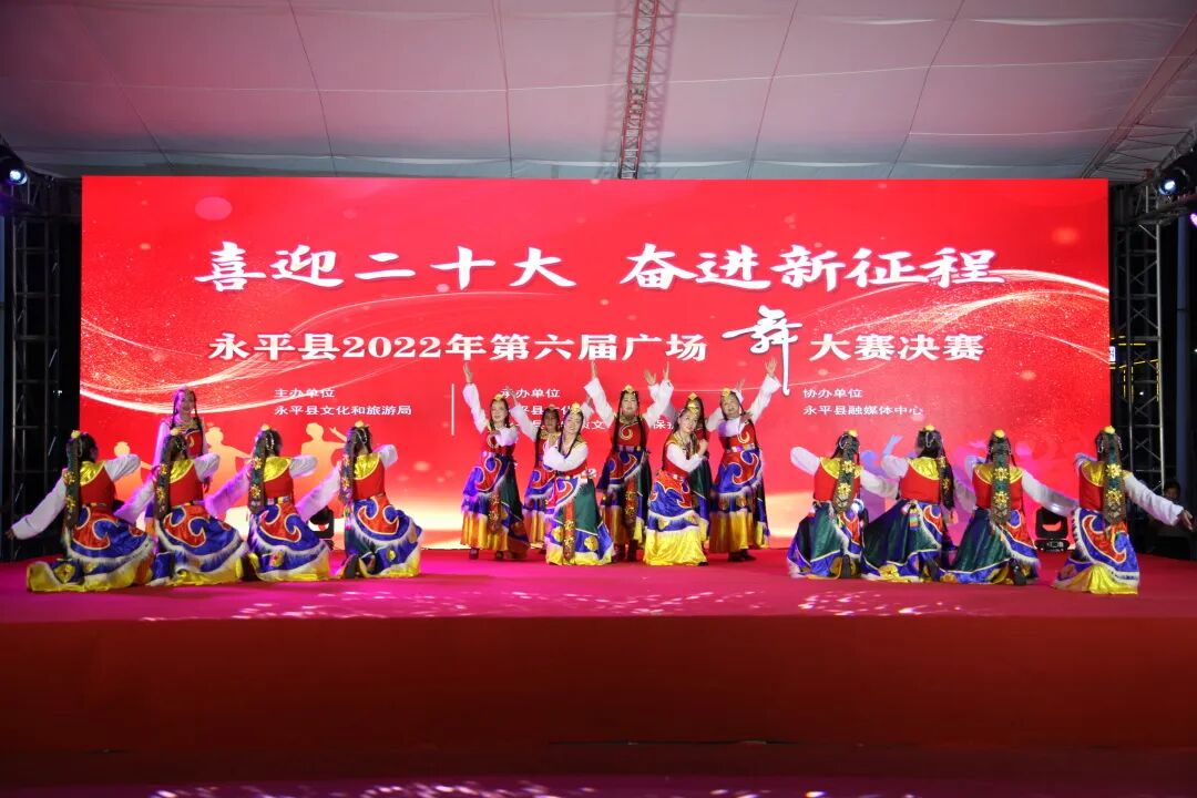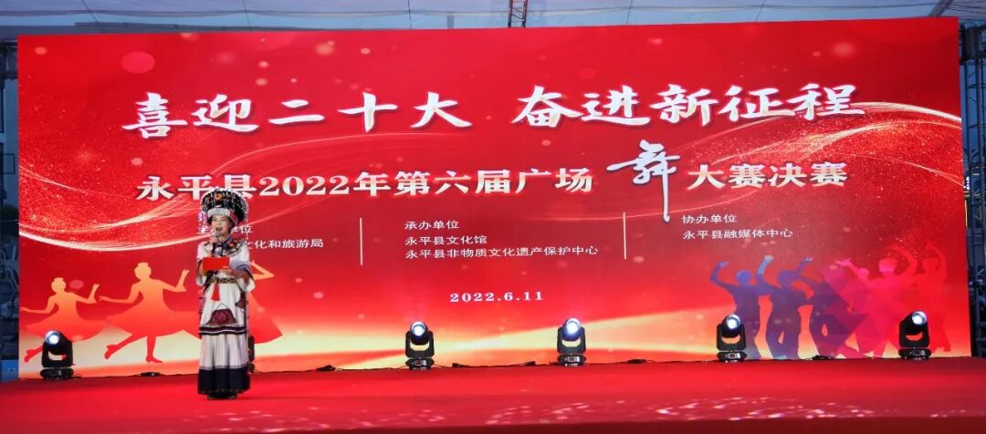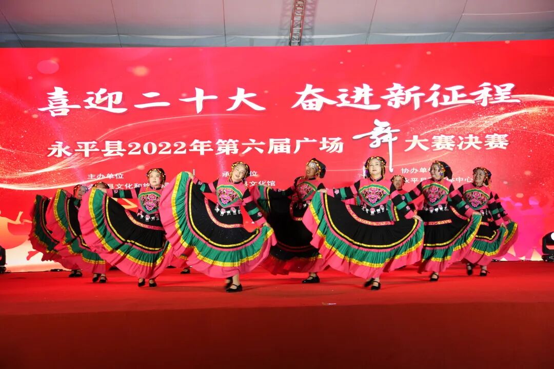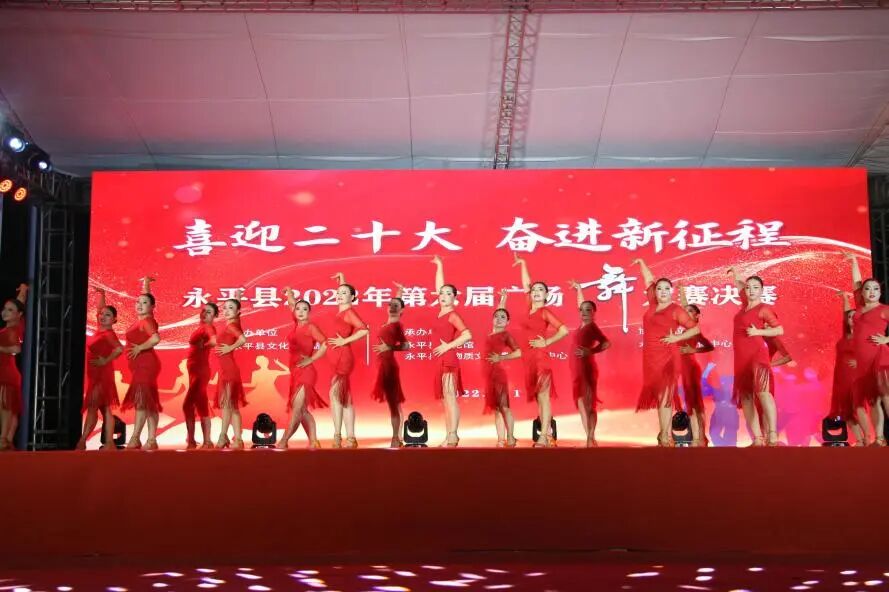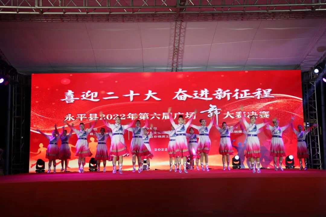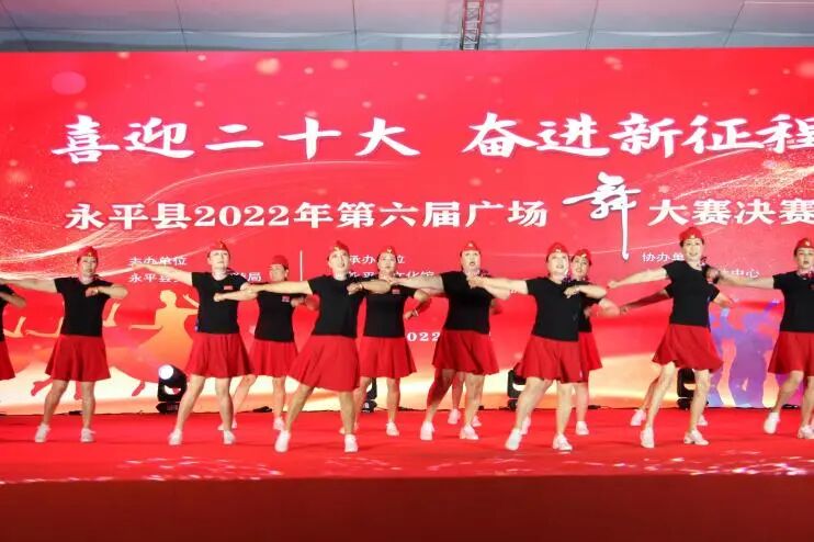 晚上20:00,开展“喜迎二十大 奋进新征程”永平县2022年第六届广场舞大赛决赛,23支队伍参加初赛(视频选拔),12支进入决赛。决赛现场,各参赛队盛装亮相,内容丰富、节奏欢快热烈,充分展现了永平人民群众热爱生活、积极向上的精神风貌,对促进群众文化繁荣,深入推进文化惠民工程起到助推作用。此次活动共评出金奖1名,银奖2名,铜奖3名,优秀奖6名。