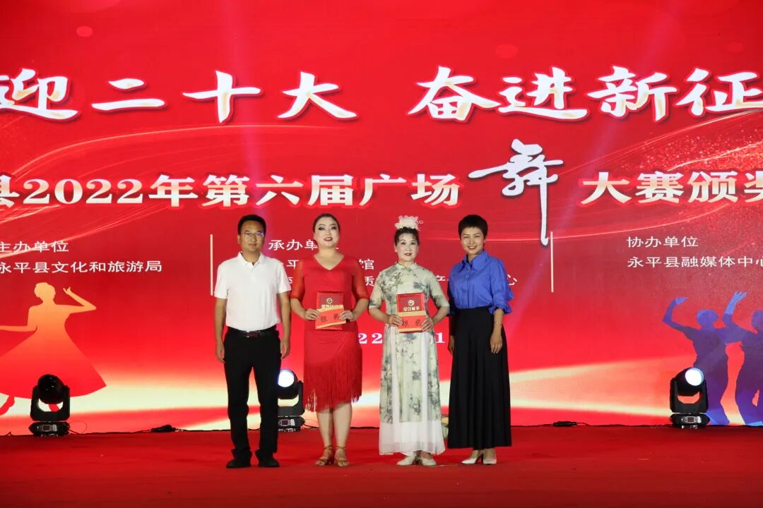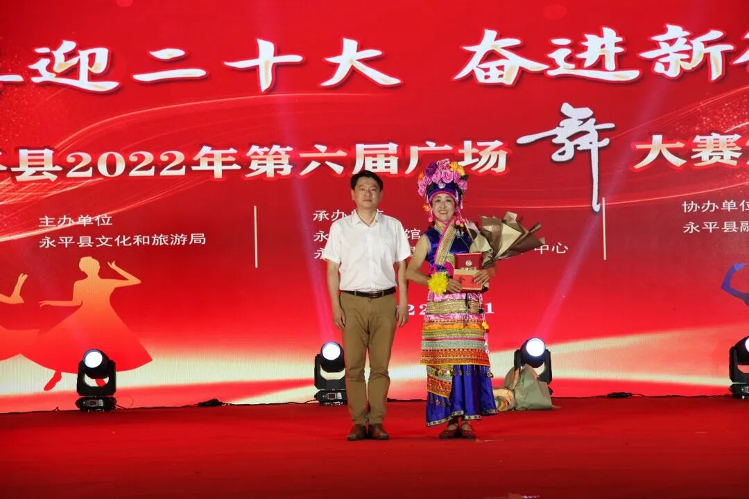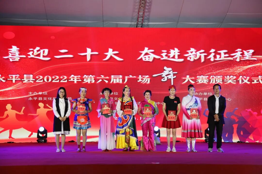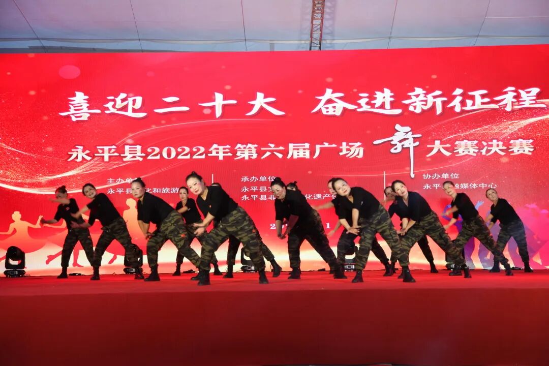 晚上20:00,开展“喜迎二十大 奋进新征程”永平县2022年第六届广场舞大赛决赛,23支队伍参加初赛(视频选拔),12支进入决赛。决赛现场,各参赛队盛装亮相,内容丰富、节奏欢快热烈,充分展现了永平人民群众热爱生活、积极向上的精神风貌,对促进群众文化繁荣,深入推进文化惠民工程起到助推作用。此次活动共评出金奖1名,银奖2名,铜奖3名,优秀奖6名。
