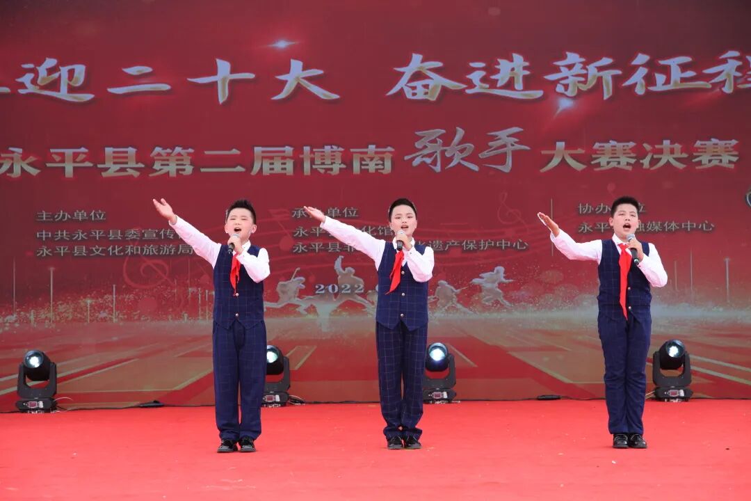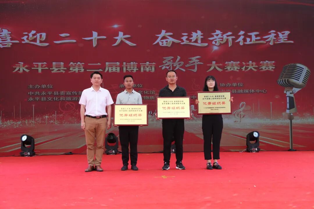 11日上午9:00,开展“喜迎二十大 奋进新征程”永平县第二届博南歌手大赛决赛,67位(组)歌手参加初赛角逐(视频选拔),最终15位(组)歌手进入决赛。决赛现场,选手们个个精神饱满、声情并茂,唱响了各族人民团结进步主旋律,唱出了各族人民共创美好未来的期盼!此次活动根据不同唱法共评出金奖3名、银奖6名、铜奖6名。博南镇人民政府、杉阳镇人民政府及北斗彝族乡人民政府获优秀组织奖。