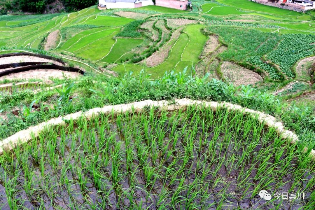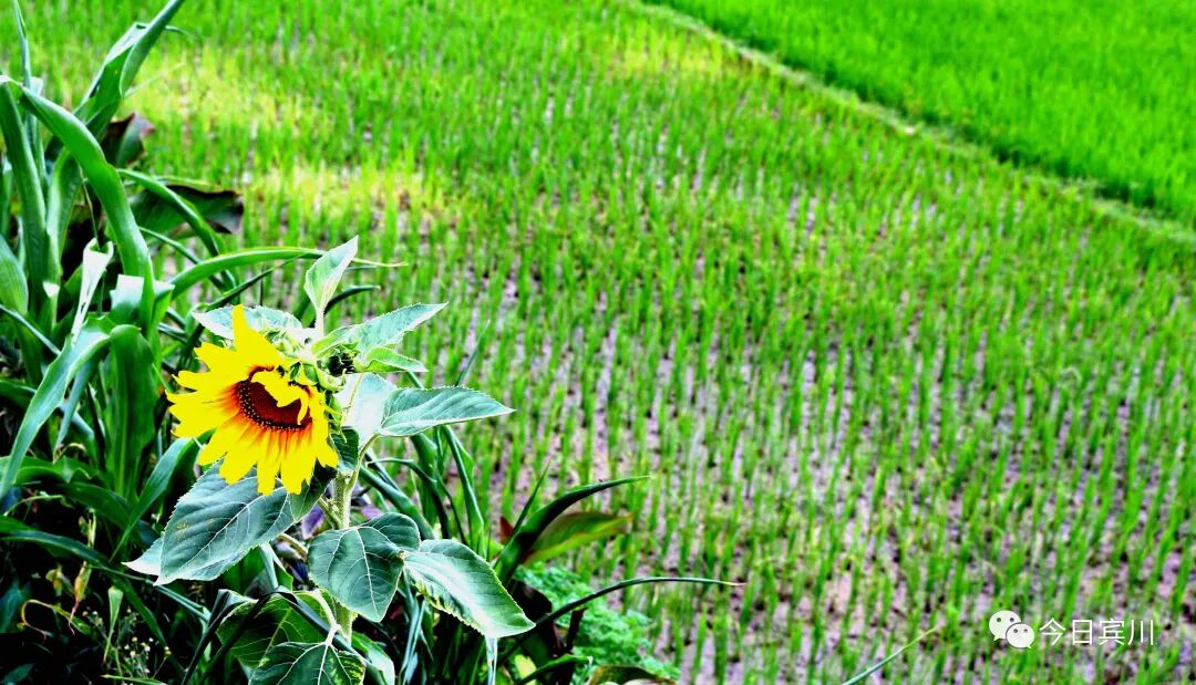 水稻苗整齐划一,茁壮成长,鲜绿淡雅,小苗已有十多厘米高,纤细柔弱,微风吹过,绿溪潺潺,稻田里蛙声一片。