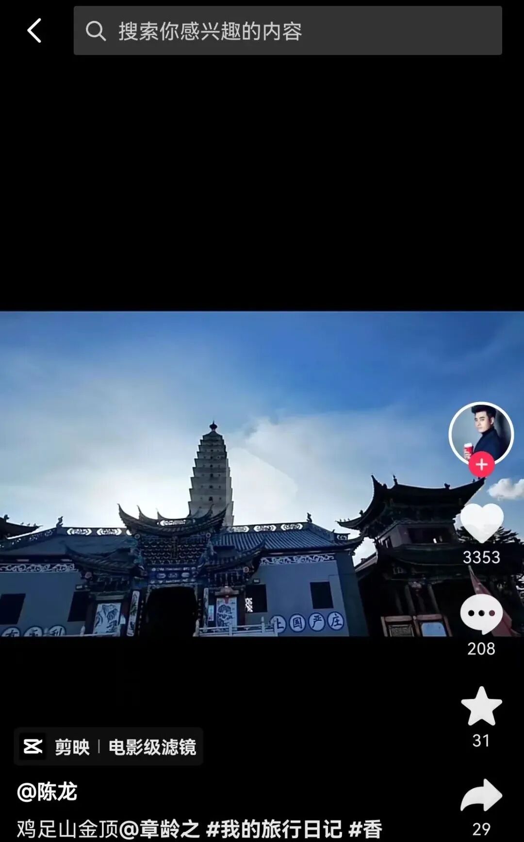 7月16日,著名影视演员陈龙,来到宾川鸡足山,在抖音平台发布了鸡足山自然美景视频,并夸赞鸡足山好美!