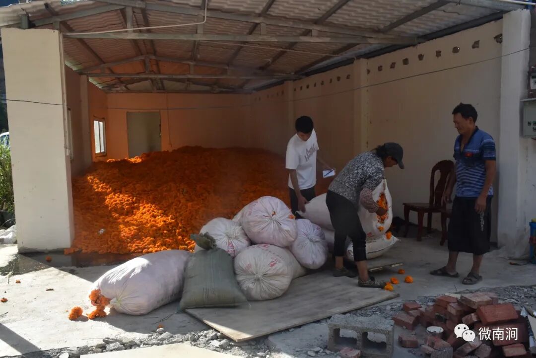 花农将采摘下来的鲜花运往米家禄村委会附近的万寿菊收购点。在收购点,记者看到已经收购了一大堆万寿菊。据了解,自7月19日开秤以来,截至目前,收购点已收购鲜花14吨,每亩万寿菊能为村民增收3000元左右。