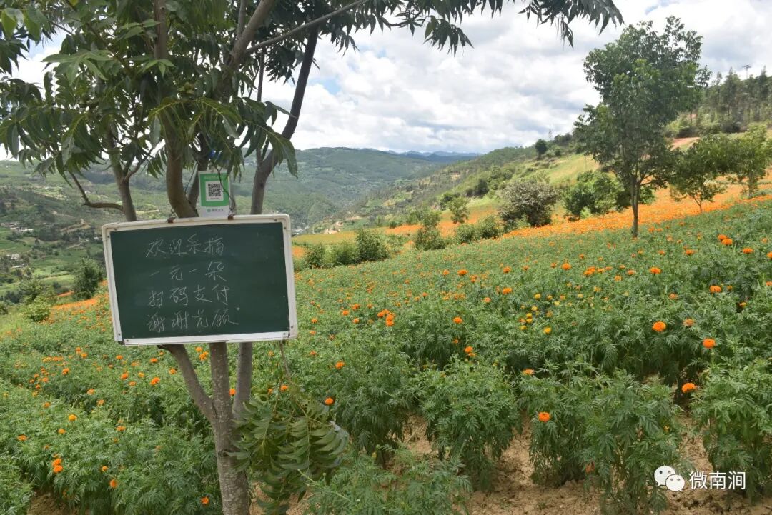 万寿菊是一种特色经济作物,有很好的药用、食用和观赏价值。与传统经济作物相比,具有田间管理简单、病虫害少、耐干旱、花期长等特点,属周期短、见效快、易管理的短平快产业。不仅可拓宽群众增收渠道,还提升了乡村颜值,一片片金灿灿的花海与青山蓝天融为一体,吸引不少游客驻足打卡拍照游览,该村还通过微信扫码支付,以1元/朵进行销售。