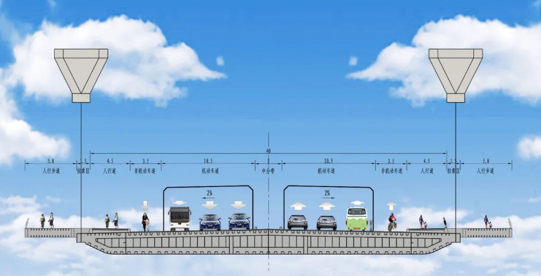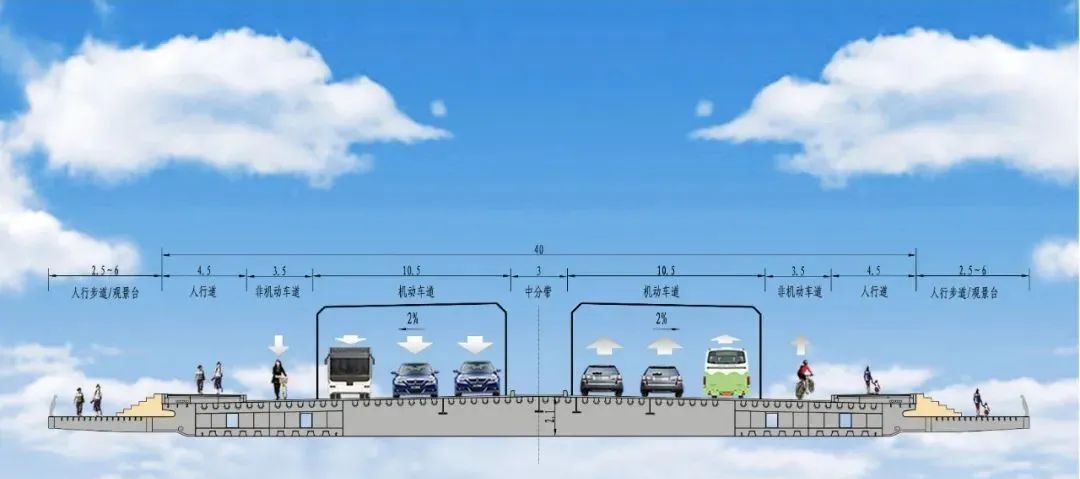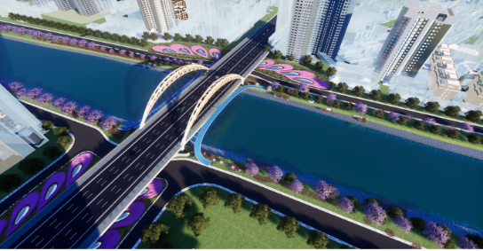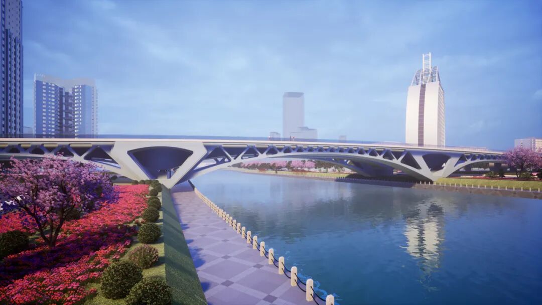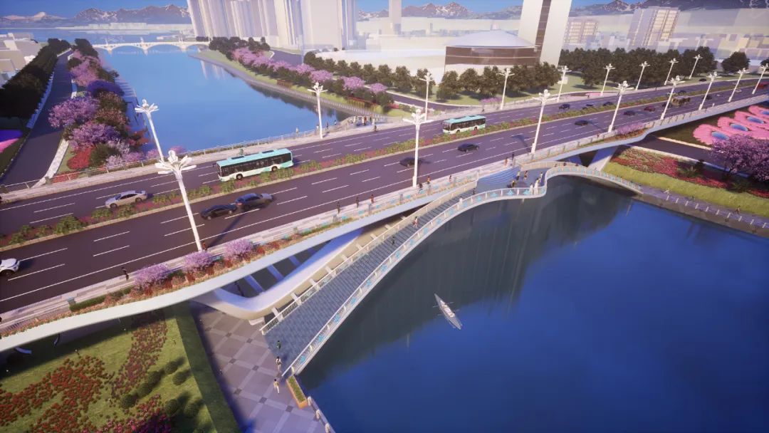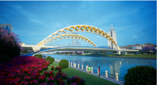 以浪漫为主题,方案选取钻石元素作为桥墩造型,在西洱河上搭建一座象征爱情的桥梁,过往车辆、行人及桥下游船游客将会获得更大视野,沉浸在苍洱碧水、云卷云舒的如诗浪漫间。主桥用桁架结构来塑造桥梁的结构美,桥梁宽度40m,跨径布置为30+120+30m,总长180m,桁架结构的刚劲和拱形的柔美得到了完美结合,整体造型简洁、大气、稳重。