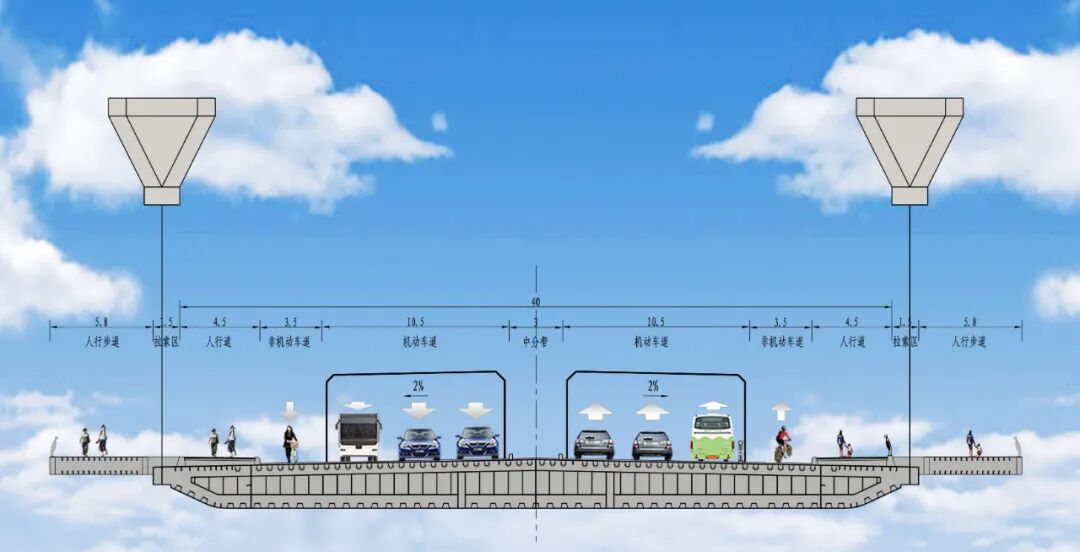 以苍洱奇观—“玉带云”、大理圣泉—“蝴蝶泉”为创作元素,桥梁结构结合云的纹理,赋予蝴蝶飞舞的形态,在两岸“云海”主题绿地景观的衬托下,泰安桥似云海中翩翩起舞的蝴蝶。主桥采用“蝴蝶拱”为造型的上承式钢拱桥结构,桥梁宽度40m,跨径布置为45+85+40+30m,总长200m,主桥两侧各设置有人行步道及观景平台,方便居民出行与观赏洱河美景。