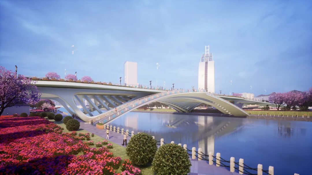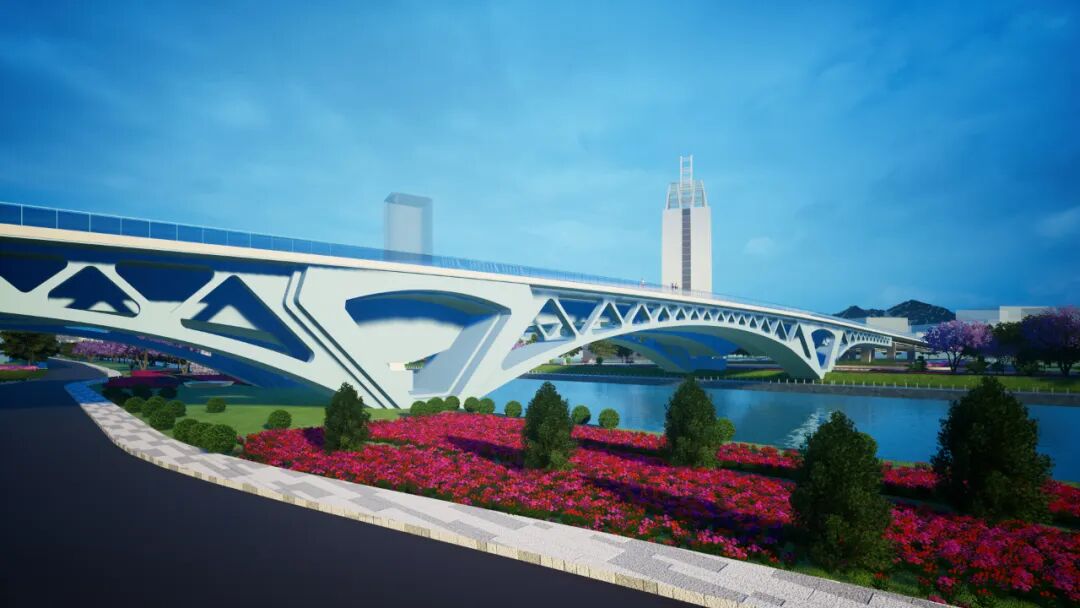 以洱海新月为意境主题,用月与水为符号,点缀杜鹃、白族民居建筑装饰图案元素,实现地域民族特色的现代演绎,延续提升泰安老拱桥的场地记忆,树立人文旅游新地标。主桥采用下承式钢拱桥结构形式,桥梁宽度40m,跨径布置为30+120+30m,总长180m,拱肋采用半透空的桁架拱,保持通透明亮,再结合缀条的层次错落布置,体现出强烈的现代感。