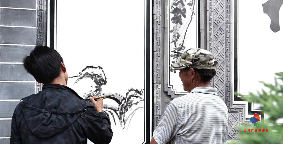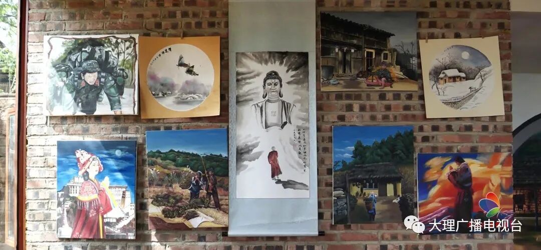 在这栋白族风格的民居里,龚久沅和他的团队历时近半个月,共作画大小180余幅。这些画作中,有传统的以黑、白、灰、蓝为基调的水墨画,也有形象逼真的丙烯彩画。