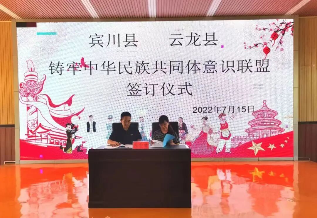 宾川县在民族团结进步创建中注重横向相连、纵向相通,加强县域内各民族与县域外各民族间的互联互动,从而促进各民族间的全面交流。先后与兄弟县市弥渡县、大理市等签署了《少数民族流动人口服务管理区域联动协作协议书》,建立流出地和流入地对接机制,让城市更好接纳少数民族群众、少数民族群众更好融入城市,促进了宾川与各兄弟县市的民族群众在定居安居、联合创业、发展经济等方面的人口流动,并为他们提供良好的服务管理条件,形成兄弟县市各民族共居共学共事共乐的全面交流局面。2022年7月,宾川县先后与大理州云龙县、贵州省安顺市西秀区举行铸牢中华民族共同体意识联盟签订仪式,共同签署《宾川县和云龙县铸牢中华民族共同体意识联盟框架协议书》和《云南省大理州宾川县和贵州省安顺市西秀区铸牢中华民族共同体意识联盟框架协议书》。框架协议的签订,标志着宾川县在促进民族交流工作中,创新了交流载体,通过线上线下,共建两地互观互学、信息互通、资源互享、经验互鉴的联建工作机制,推进两地各民族青少年交流、各民族互嵌式发展,以民族团结交流促进文化旅游、经济等方面的发展。将铸牢中华民族共同体意识,从县内、县外的小地区融入到了推进国家西部大开发的新格局,开创了全国首个跨省组建的铸牢中华民族共同体意识联盟,推动民族团结进步创建工作实现新发展、取得新突破。