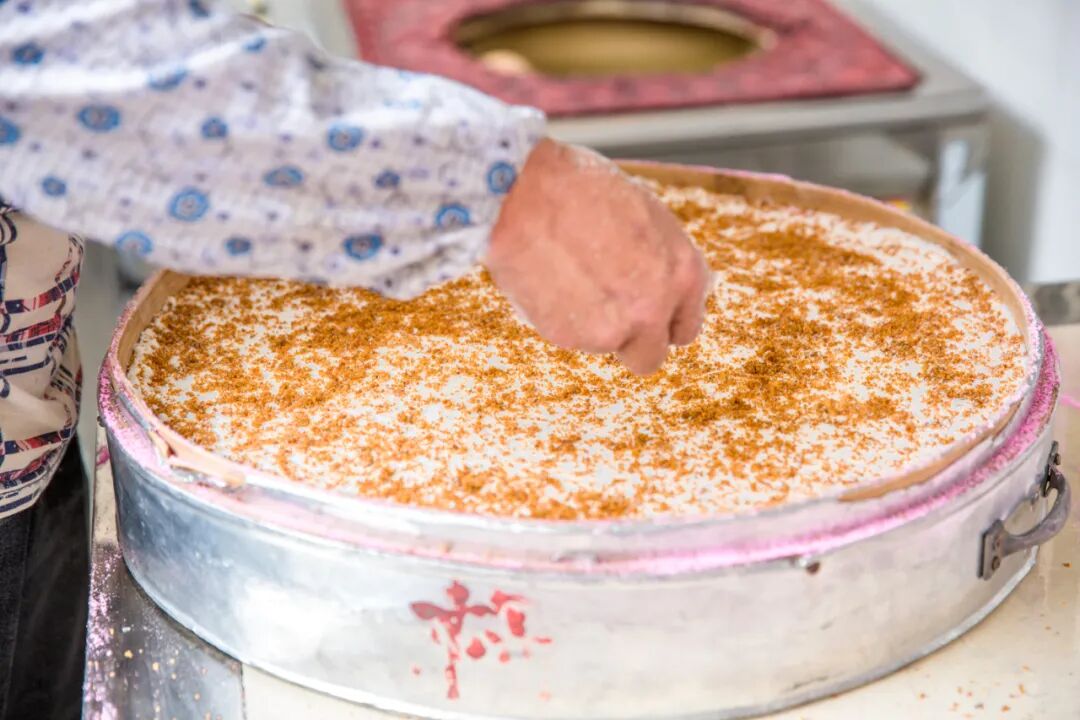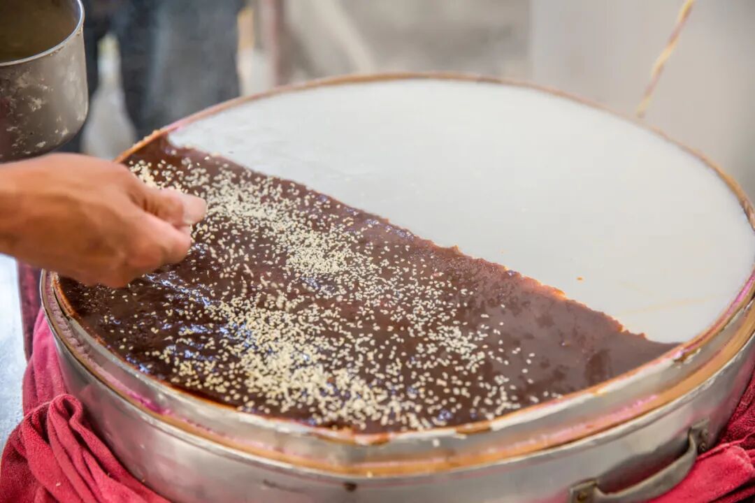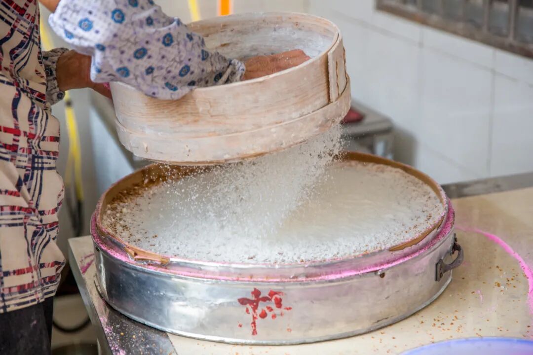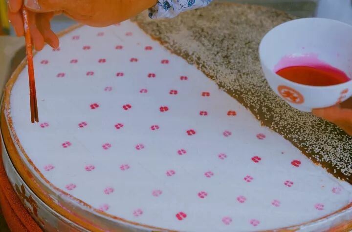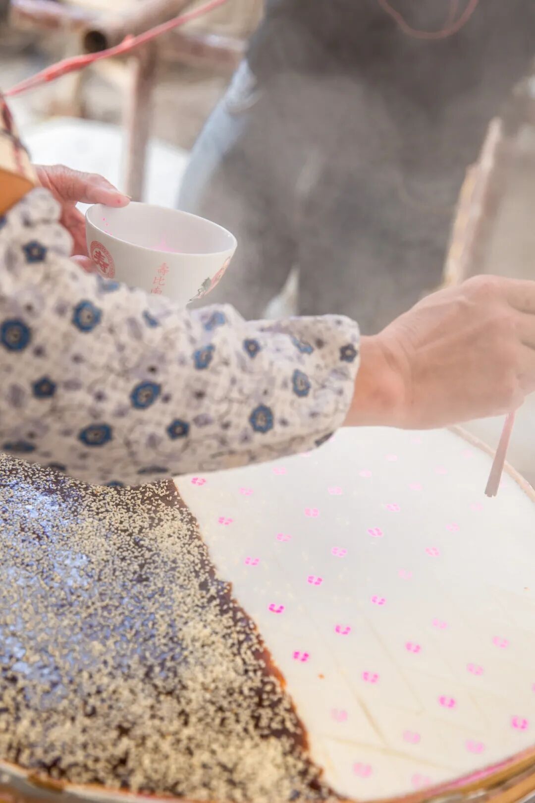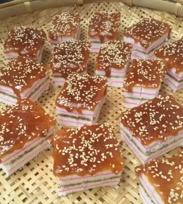 蒸米糕用于待客时,表面加红糖、玫瑰糖;用于祭祖供佛时,糕面须插鲜花。每年清明时节,青蚕豆成熟上市,在米面中掺进豆米粉,糕呈绿黄色,食味更佳。这种青豆米糕,多用作上山扫墓和招待嘉宾贵客。菱形糕面上,或是点缀着小小红点,或是描画着喜庆字样,亦或是被红糖和芝麻覆盖……米糕的诱人,在美味之余,也有颜值的加分,只看一眼,便再也挪不开步子。