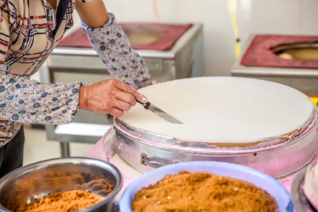 作为传统小吃,鹤庆米糕是鹤庆人逢年过节、婚丧娶嫁款待宾客或祭祀所用的传统食品,可分为干糕和水糕两大类。制作干糕,先将上等白米泡软后,压磨成粉,然后用薄荷、橙皮汁加红糖将粉碾细,用细筛筛入甑子内,再用薄刀小心划成长2寸、高1.5寸、厚0.5寸的小块,用大火蒸熟。干糕中,又以喜庆干糕为上品,喜庆干糕又分夹层糕和色糕两种。夹层糕呈菱形,比普通干糕稍厚略大,中有红糖、薄荷、橙皮、枣泥、龙眼的混合夹层;色糕呈正方形,中间有红色腰线,表面为红色罩面,红白分明,质细而美观。制作水糕,是糕粉制成后,加适量的糯米面,蒸发亦如干糕,但不加糖,待糕蒸熟后再把红糖撒在上面,待糖蒸化后再撒上芝麻或苏子而成。