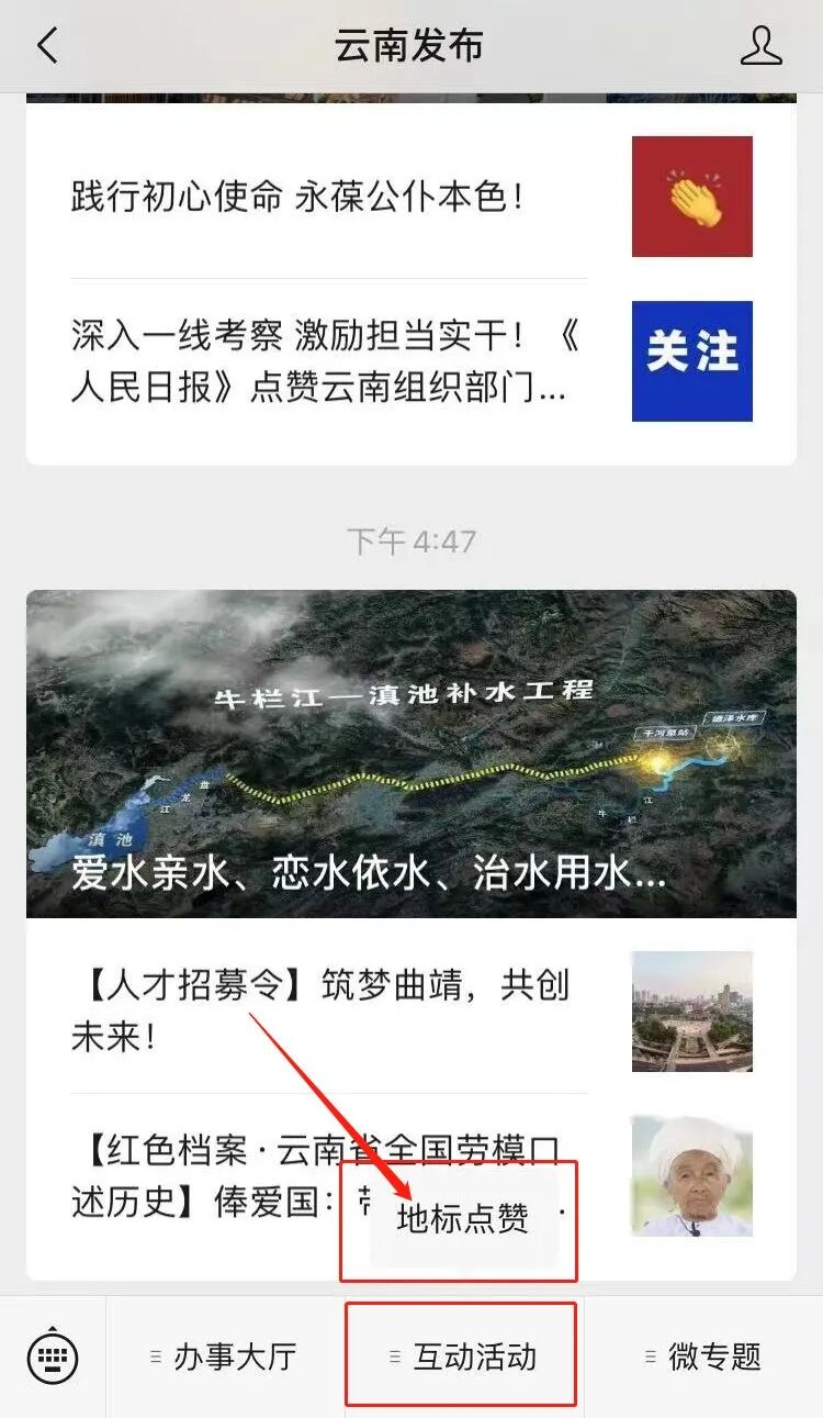 2、在“云南发布”微信公众号首页,点击主页菜单栏“互动活动”,然后点击“地标点赞”,即可进入点赞页面。