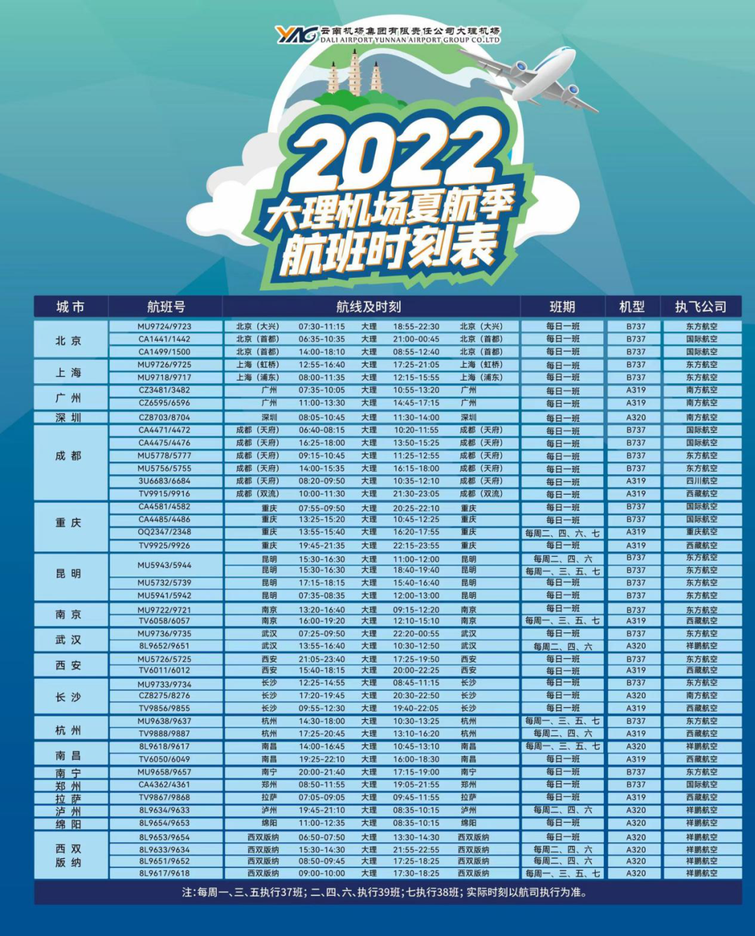 大理机场暑期通航城市上座率排行依次为:北京、上海、成都、广州、深圳、长沙、重庆、西安、南京、昆明、版纳、绵阳、泸州。