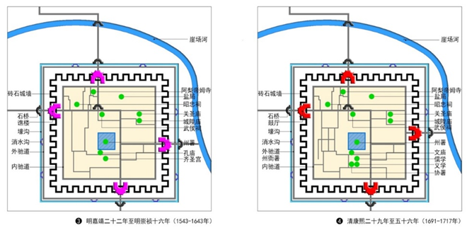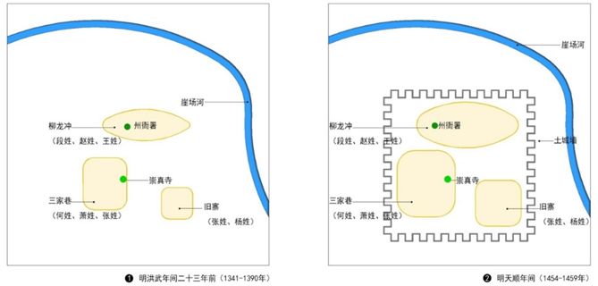 剑川古城为保持城里的风水,还有意将东南和西城门相互错开,四门街道结合处采取“丁”字形相接,而非“十”字形,各门的巷道曲折有度,民居建筑更显幽深,利于藏风聚气。巷道一旁流水不绝,既能防火又符合风水的要求。