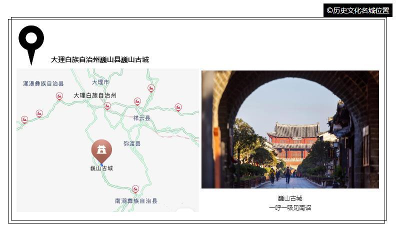 1994年国务院公布巍山为国家历史文化名城,古城城方如印,街巷分明,完整保留了明清时期的棋盘式古城池格局和历史建筑风貌特色,街巷空间格局和大量的传统民居保存完好且规模成片,有各种不同形式的建筑集中融汇并存,保存有白族、彝族、回族、汉族等多民族特色民居和多样民族技艺。