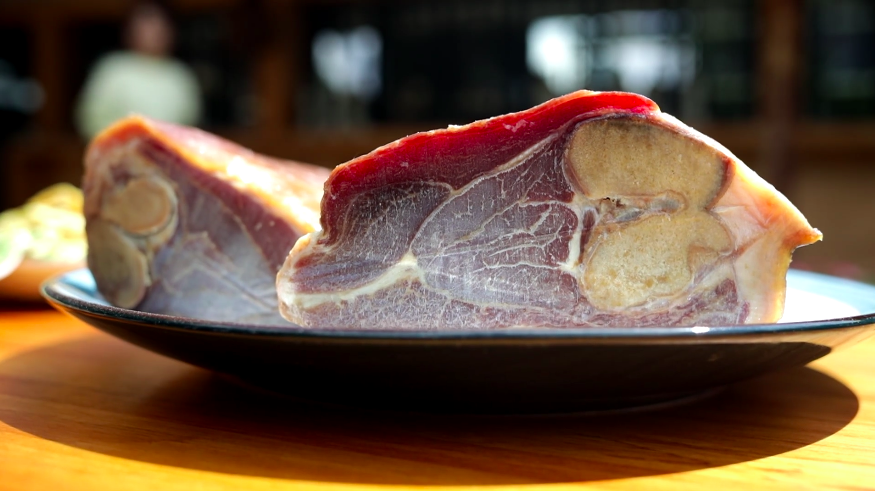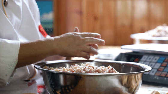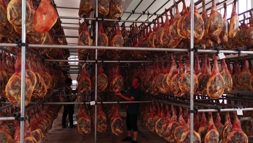 仇亚雄:虽然是一个小小的火腿饼,但我们的用料都是最好的,火腿选用了上好的三年以上的诺邓火腿。买火腿,我都是亲自去诺邓挑的,一斤火腿中有6两是最精华的部分。