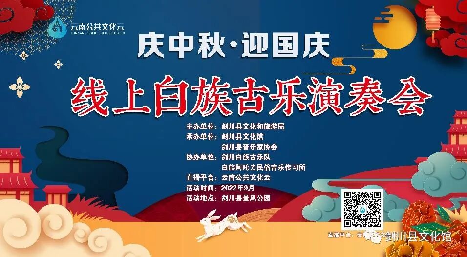 9月13日19:00,庆中秋·迎国庆线上白族古乐演奏会将通过云南公共文化云、剑川县文化馆视频号进行实时直播,您可通过以下方式观看精彩直播,赶紧行动起来吧!