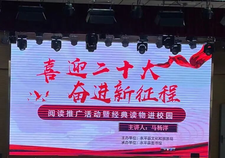 为喜迎党的二十大胜利召开,激发广大青少年儿童阅读兴趣,培养青少年儿童阅读习惯,构建书香永平,永平县图书馆借助永平县第七届中学生书画巡展之机,于9月14日至9月22日在全县12所中小学开展“喜迎二十大 奋进新征程”经典读物推荐阅读推广进校园活动。