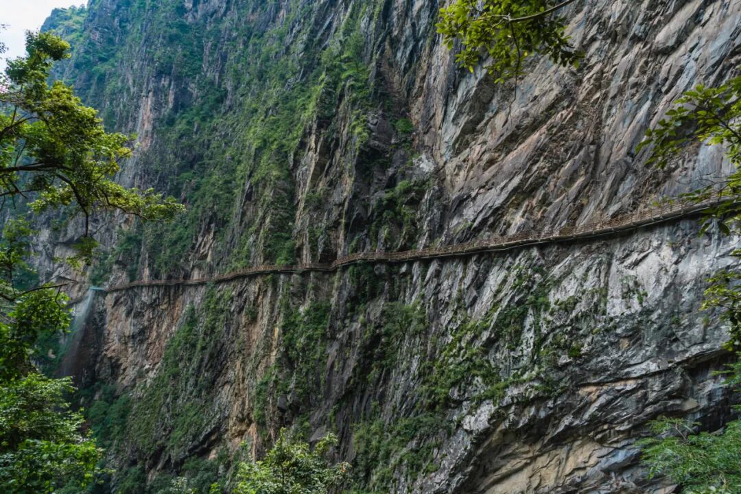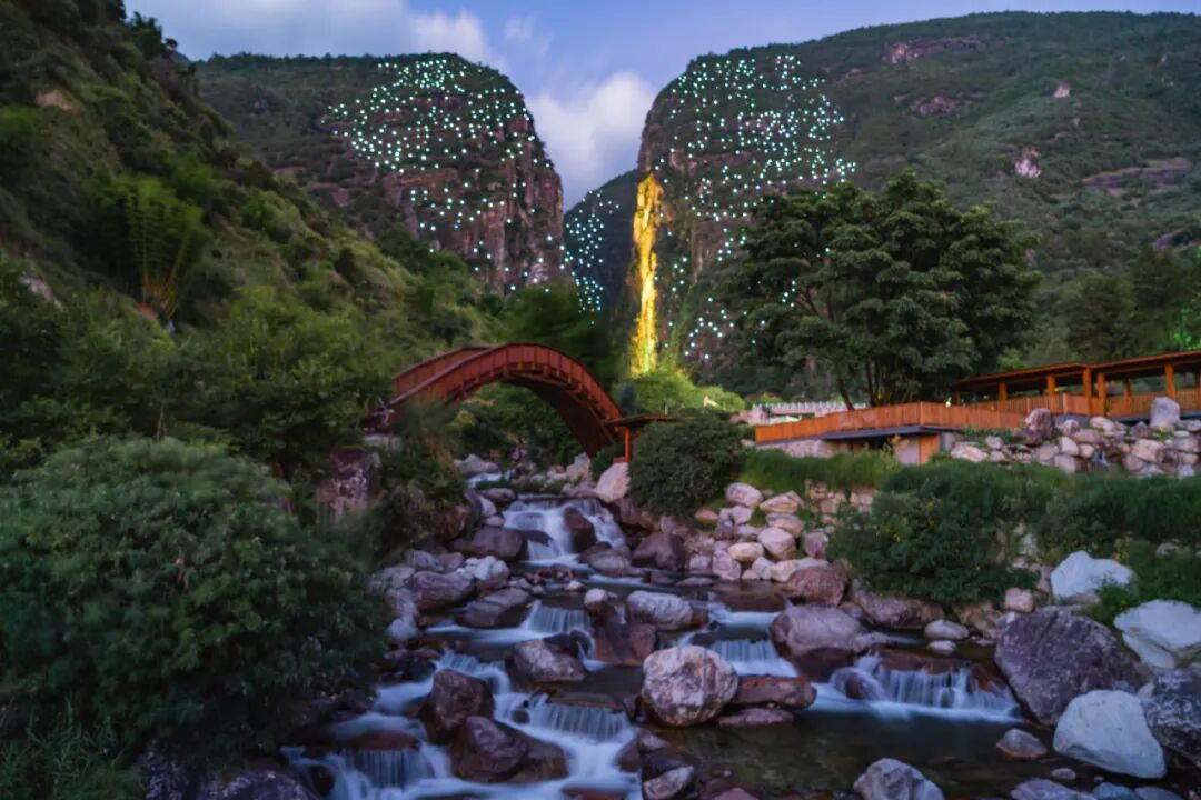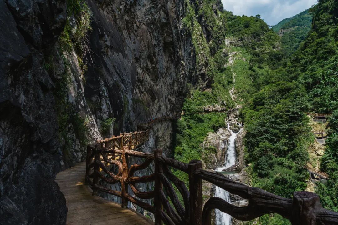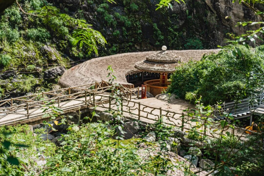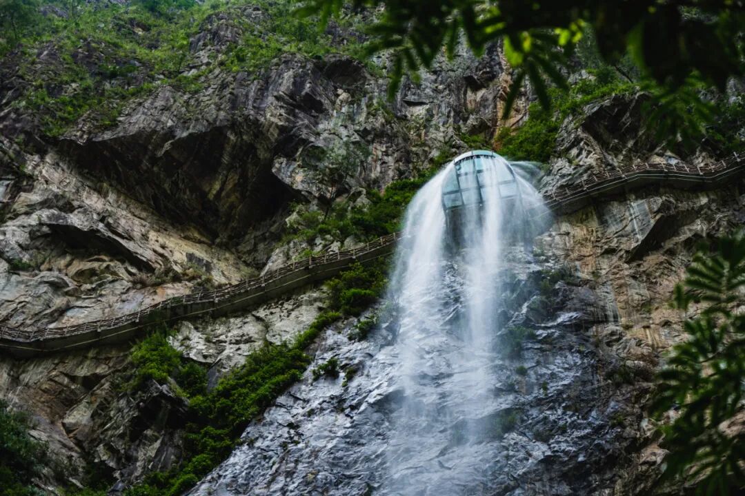 七道水帘围着半圆型玻璃栈道喷泻而下