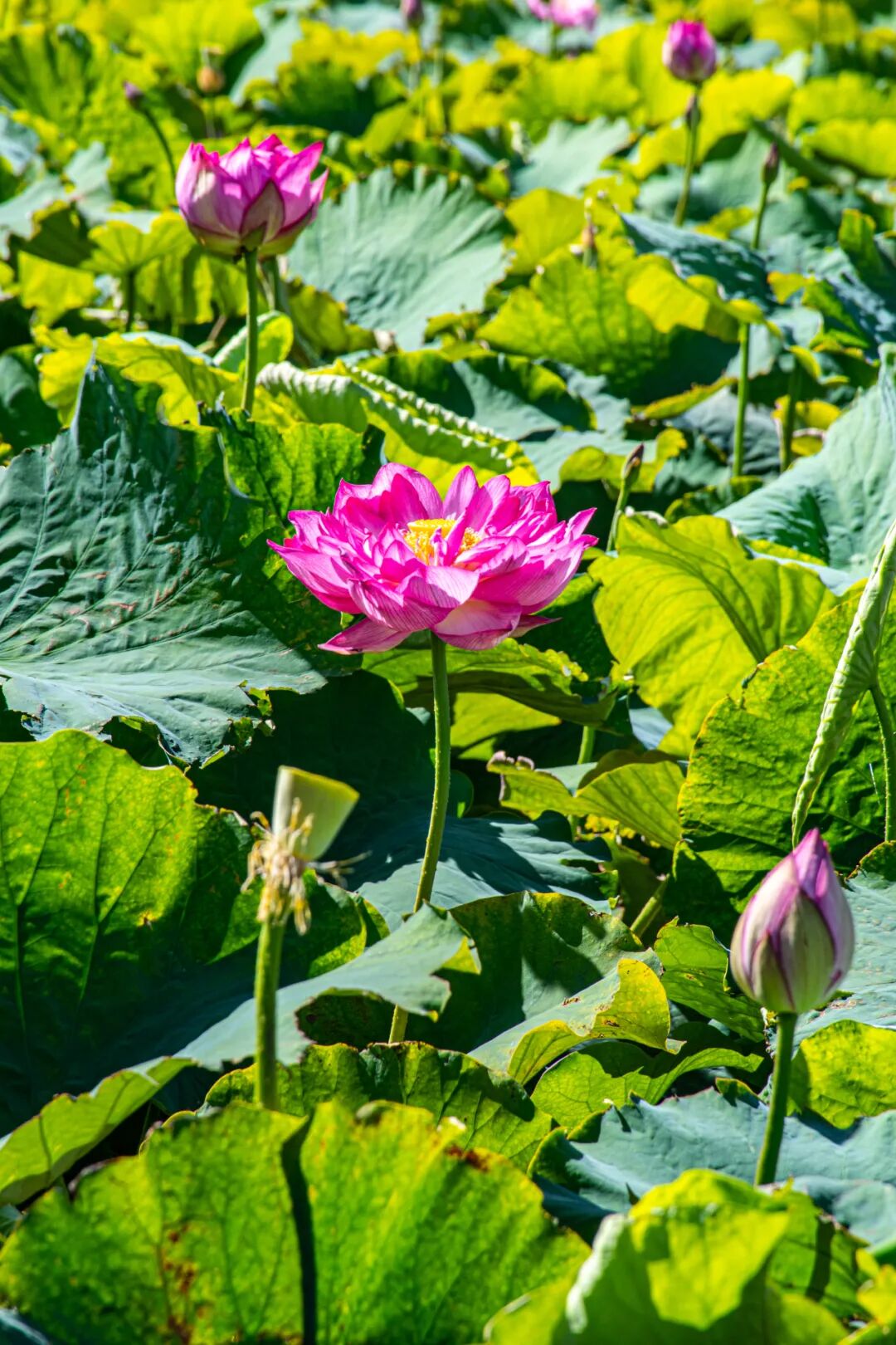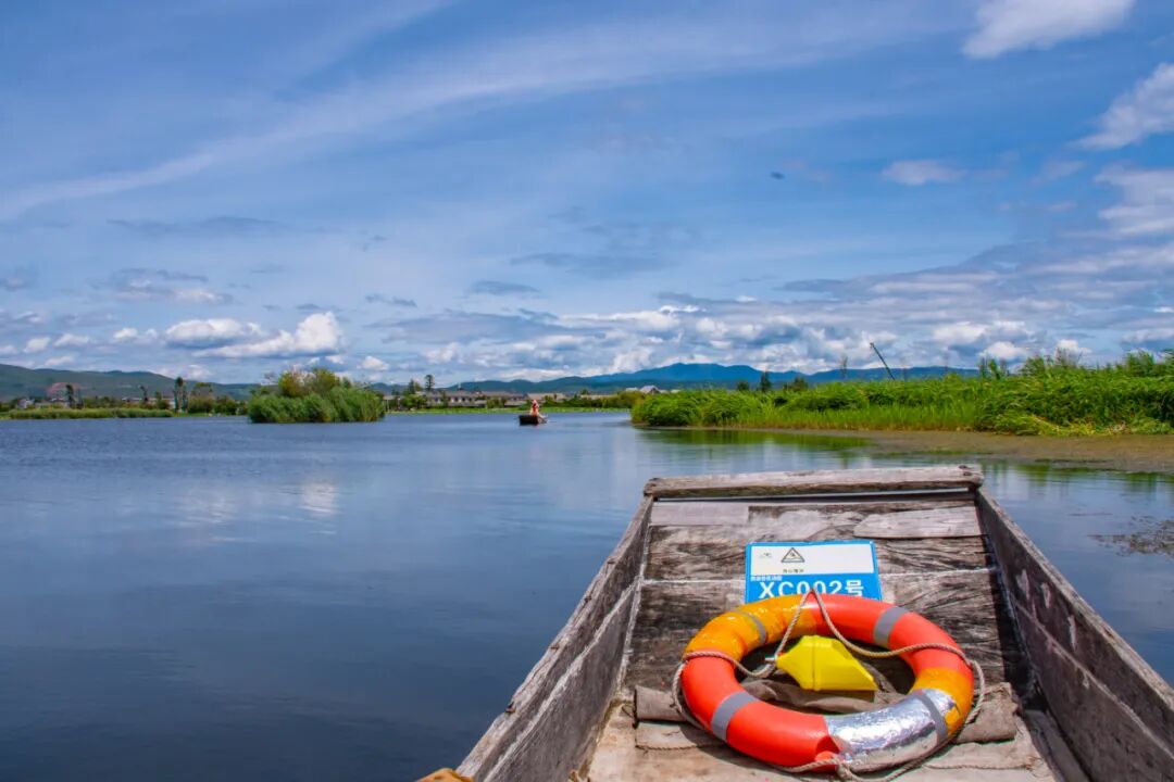 航道里狭长的船只在航行,熟悉水性和水域的当地人为掌舵人,引领着人们穿梭在苇荡间,时不时还能听到苇荡中传来的歌声。