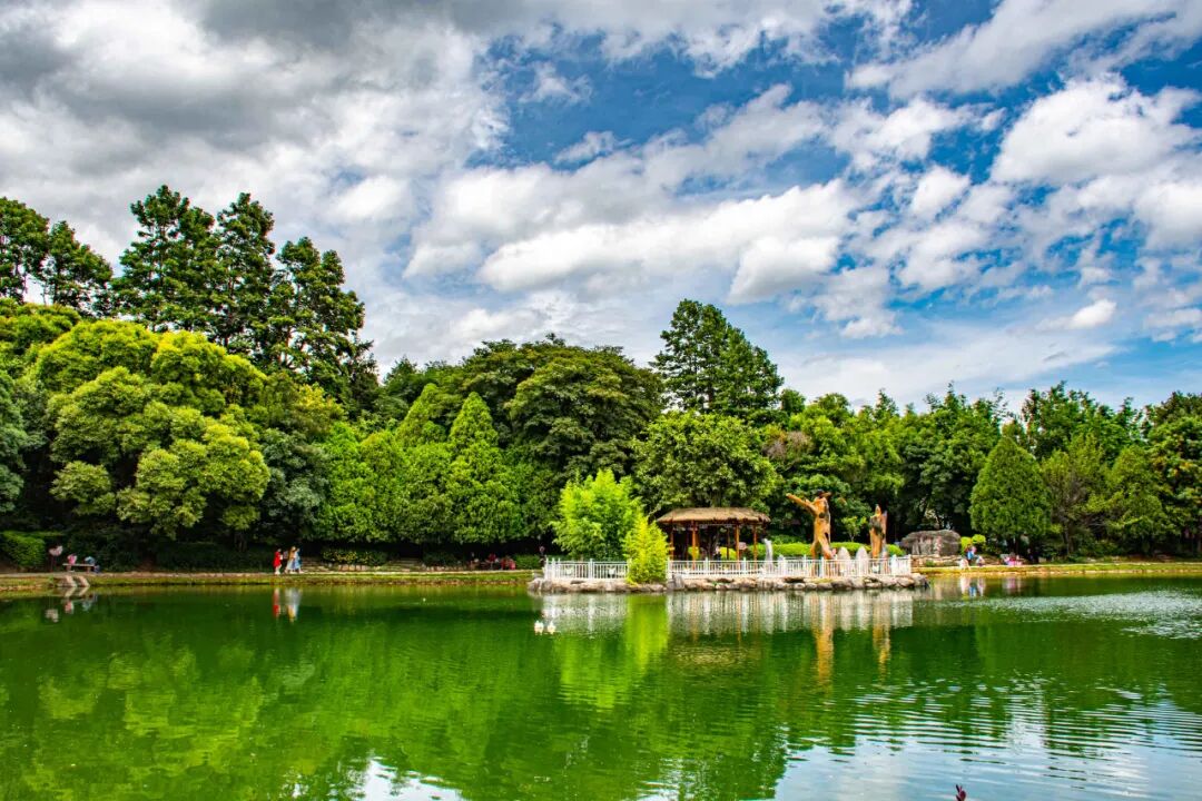 浓荫古树蔽日,青石小道密布,鲜花在树丛中烂漫,泉水在蝴蝶泉中叮咛,情人湖边歌声飞扬。