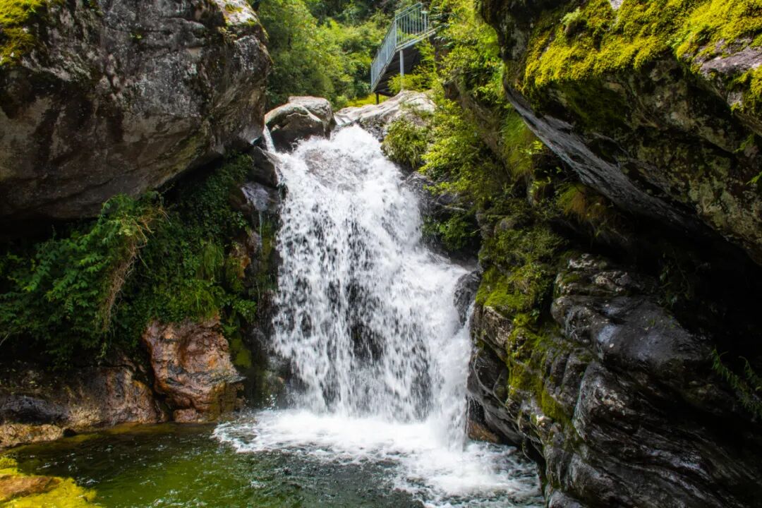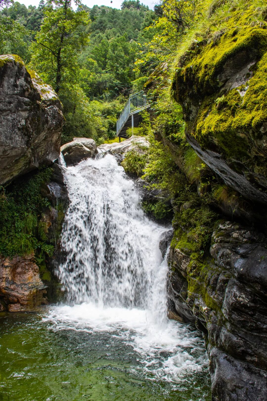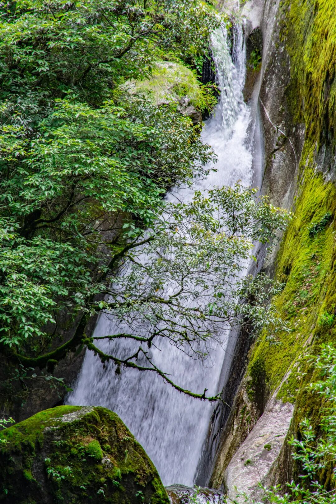 瀑布挂在黝黑长满青苔的岩石上,有的瀑布被树木遮挡窥不见全貌,一黑一白,让人觉得瀑布更加的纯洁、灵性和神秘。